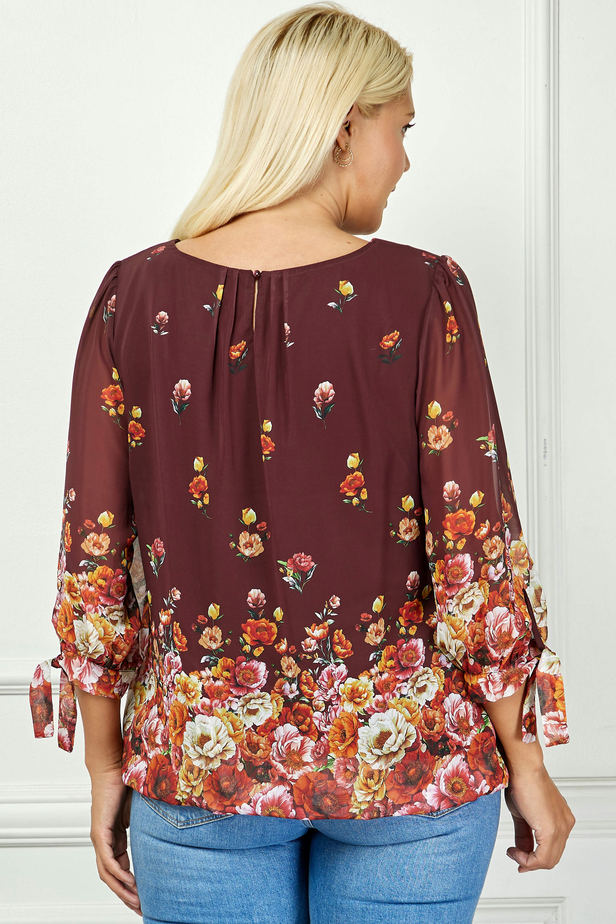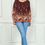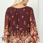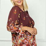 3/4 Tie Sleeve Pleat Neck Bubble Blouse in Burgundy - Plus