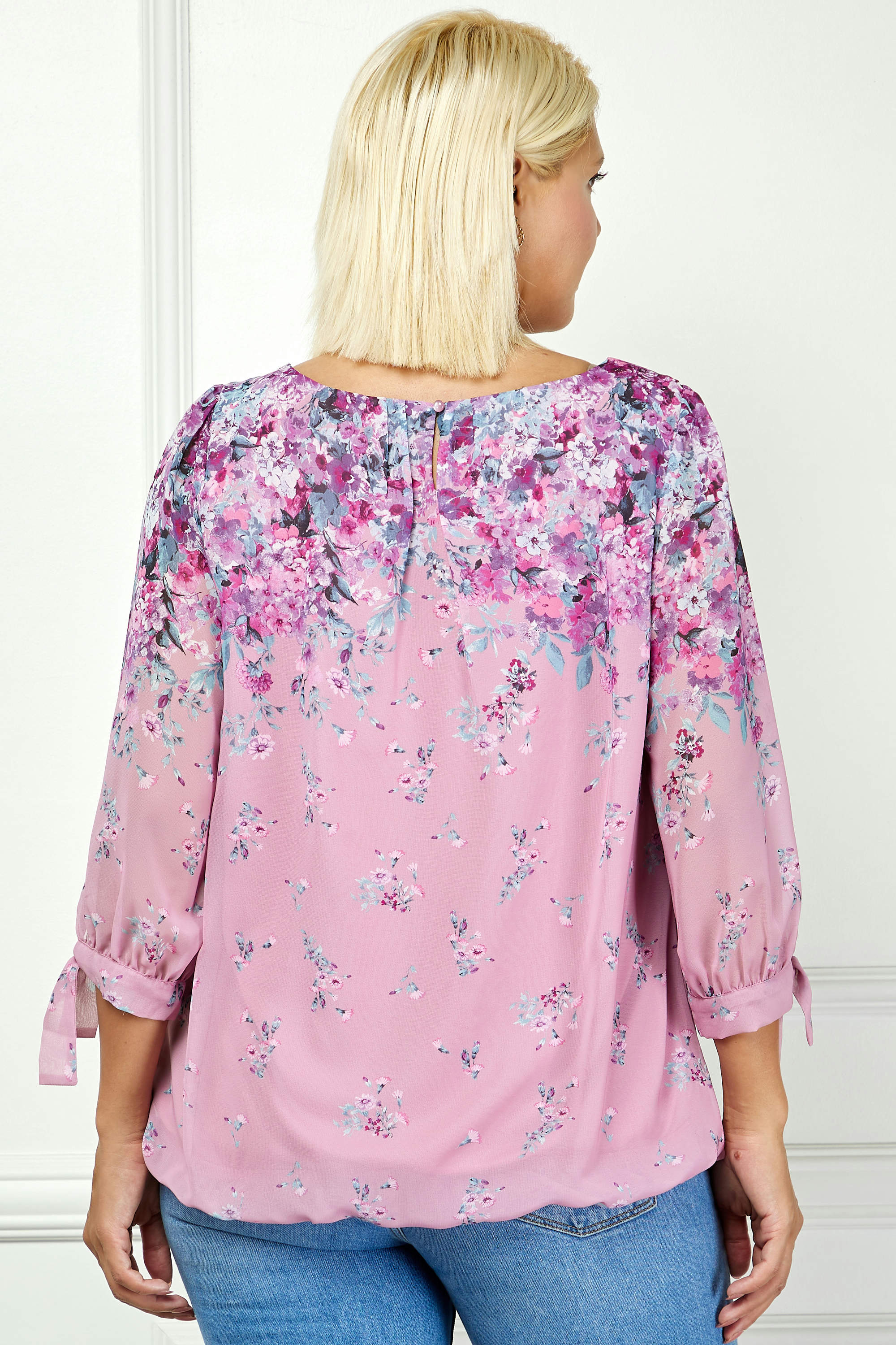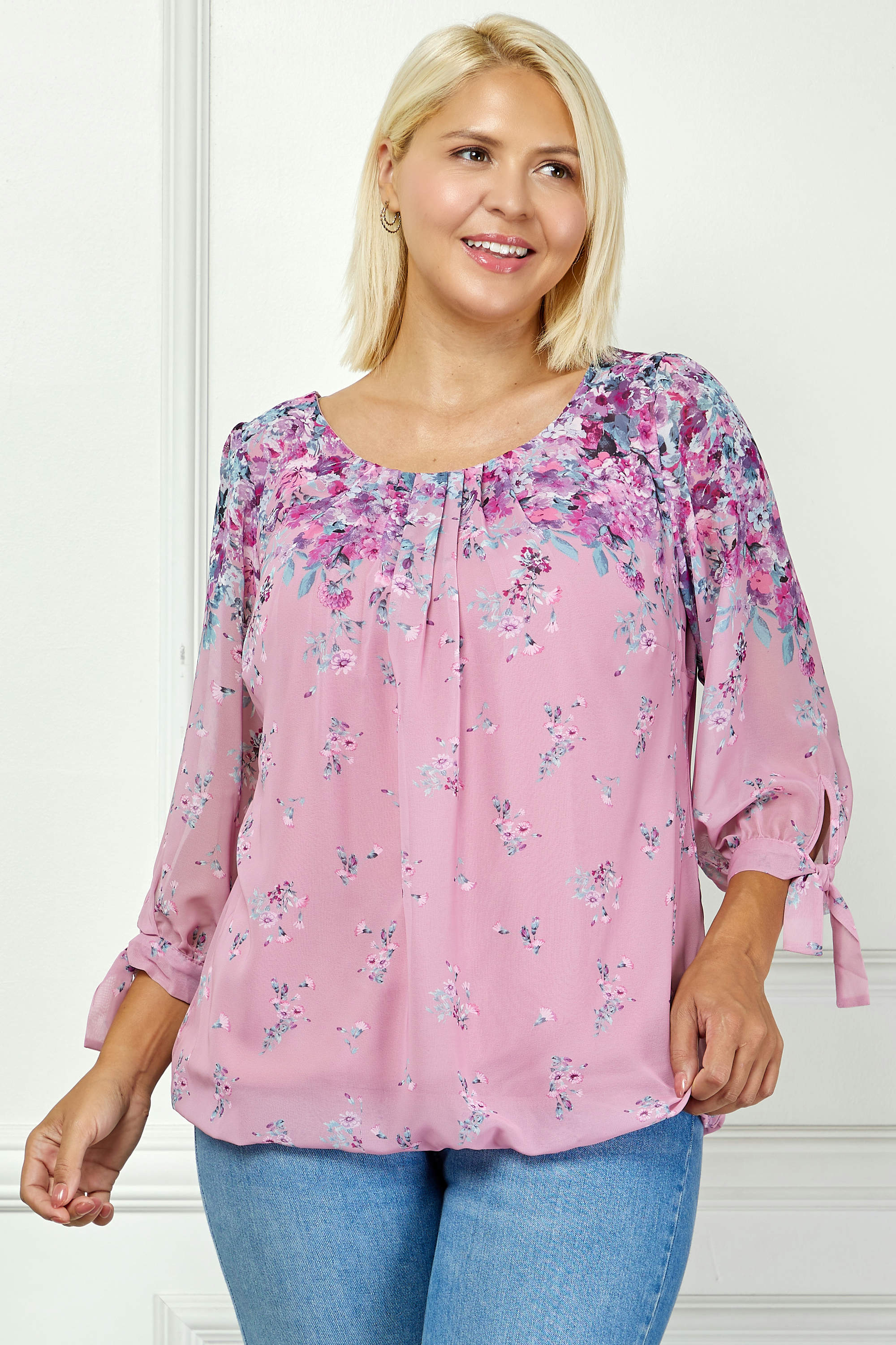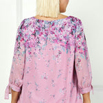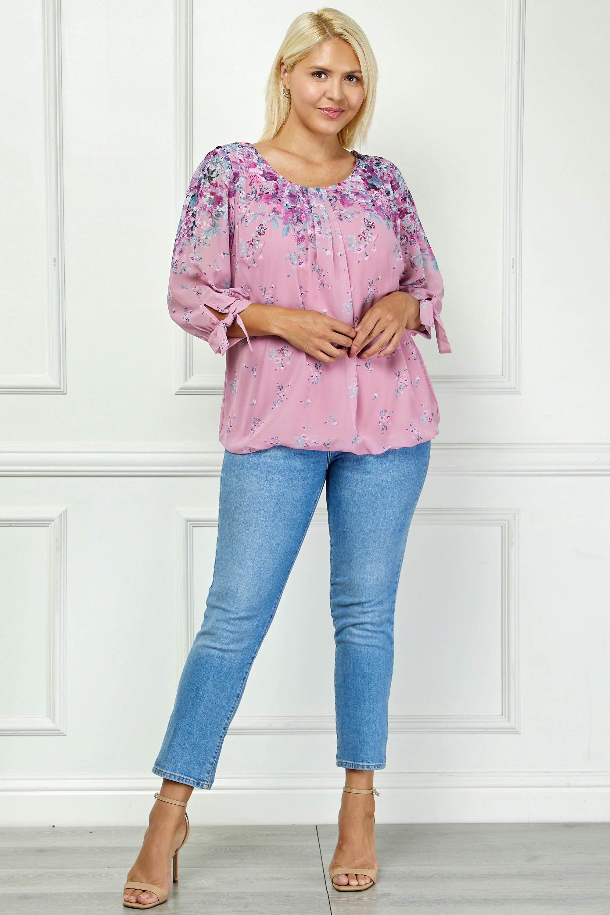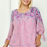 3/4 Tie Sleeve Pleat Neck Bubble Blouse in Pink - Plus