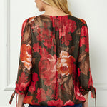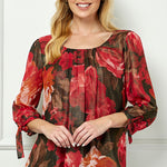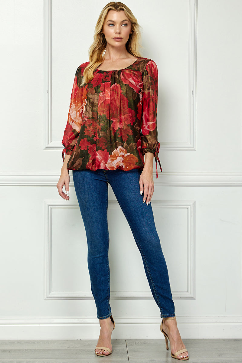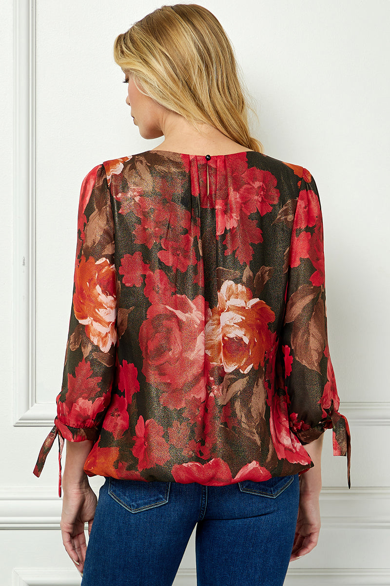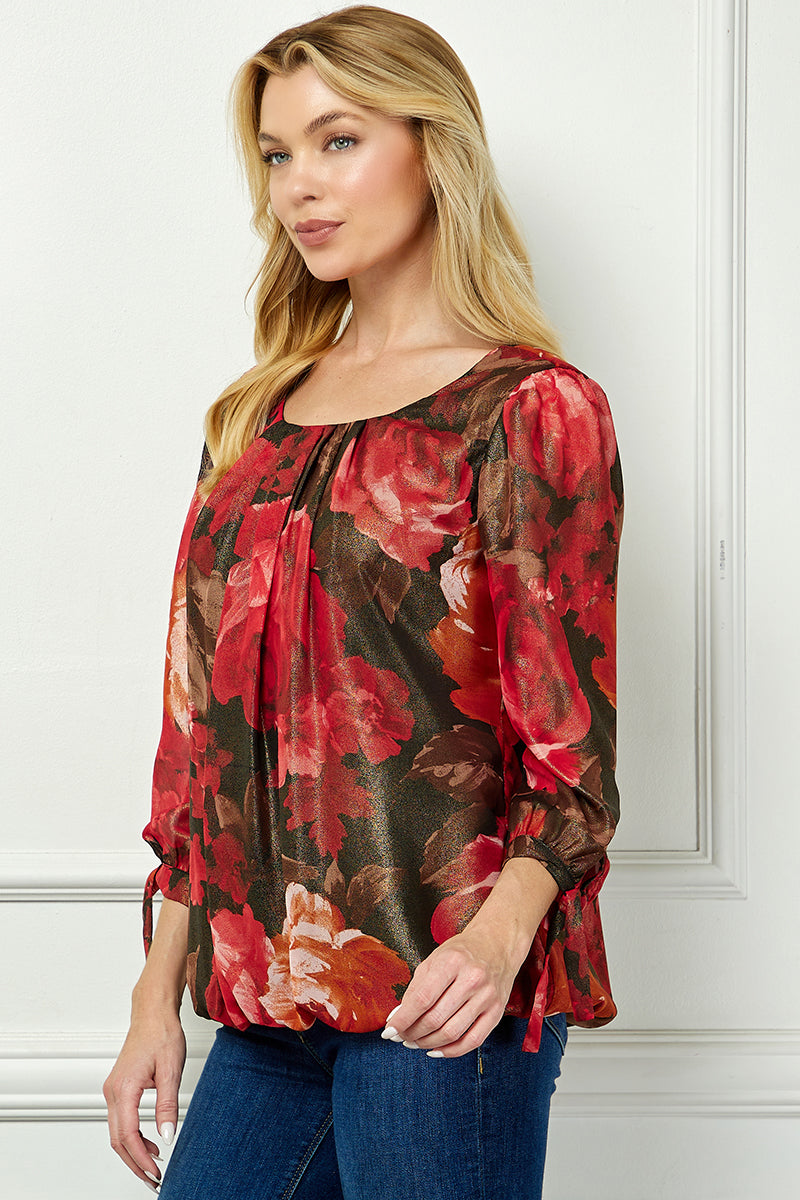 3/4 Tie Sleeve Pleat Neck Bubble Blouse in Red