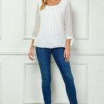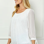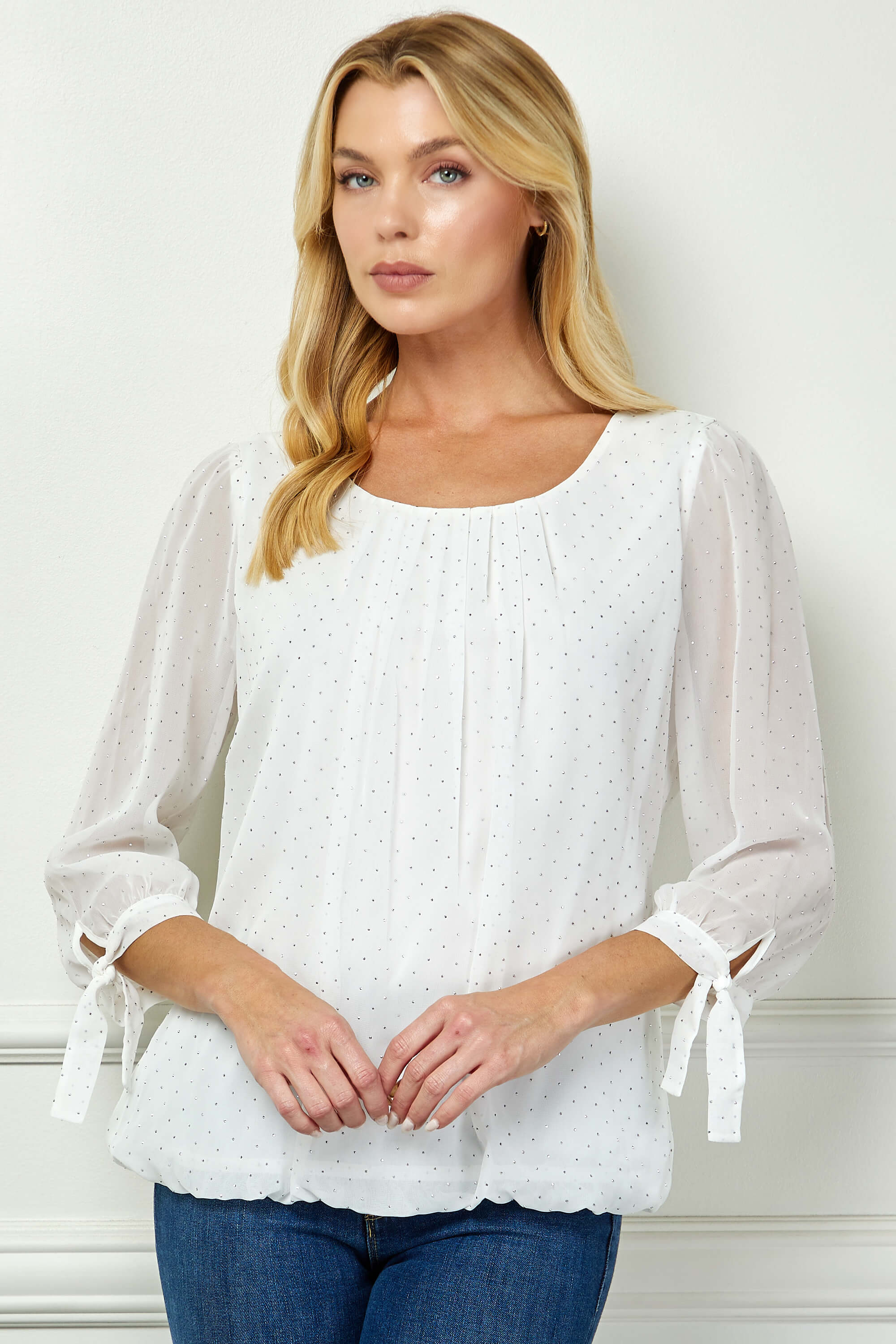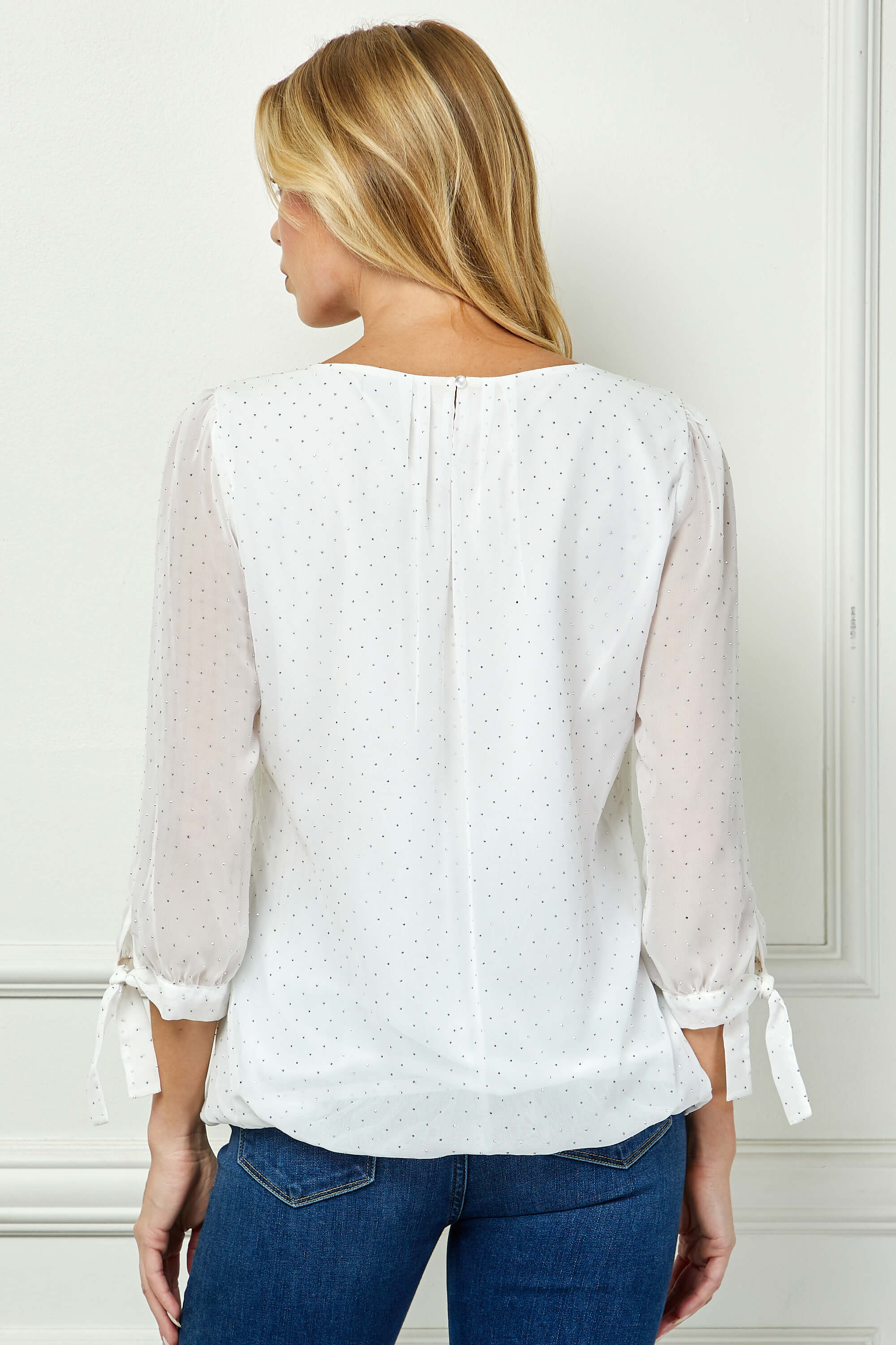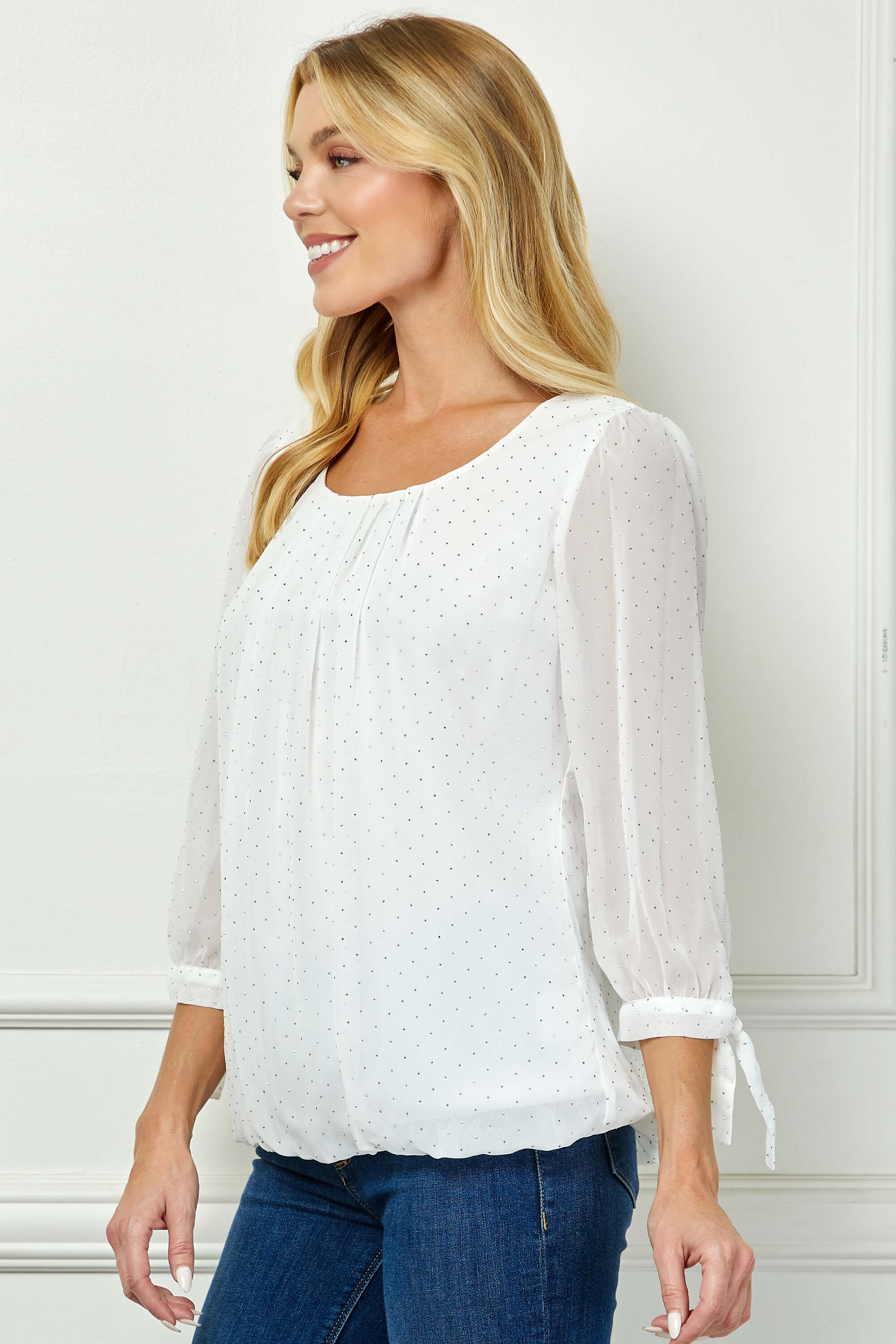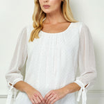 3/4 Tie Sleeve Pleat Neck Bubble Blouse in White