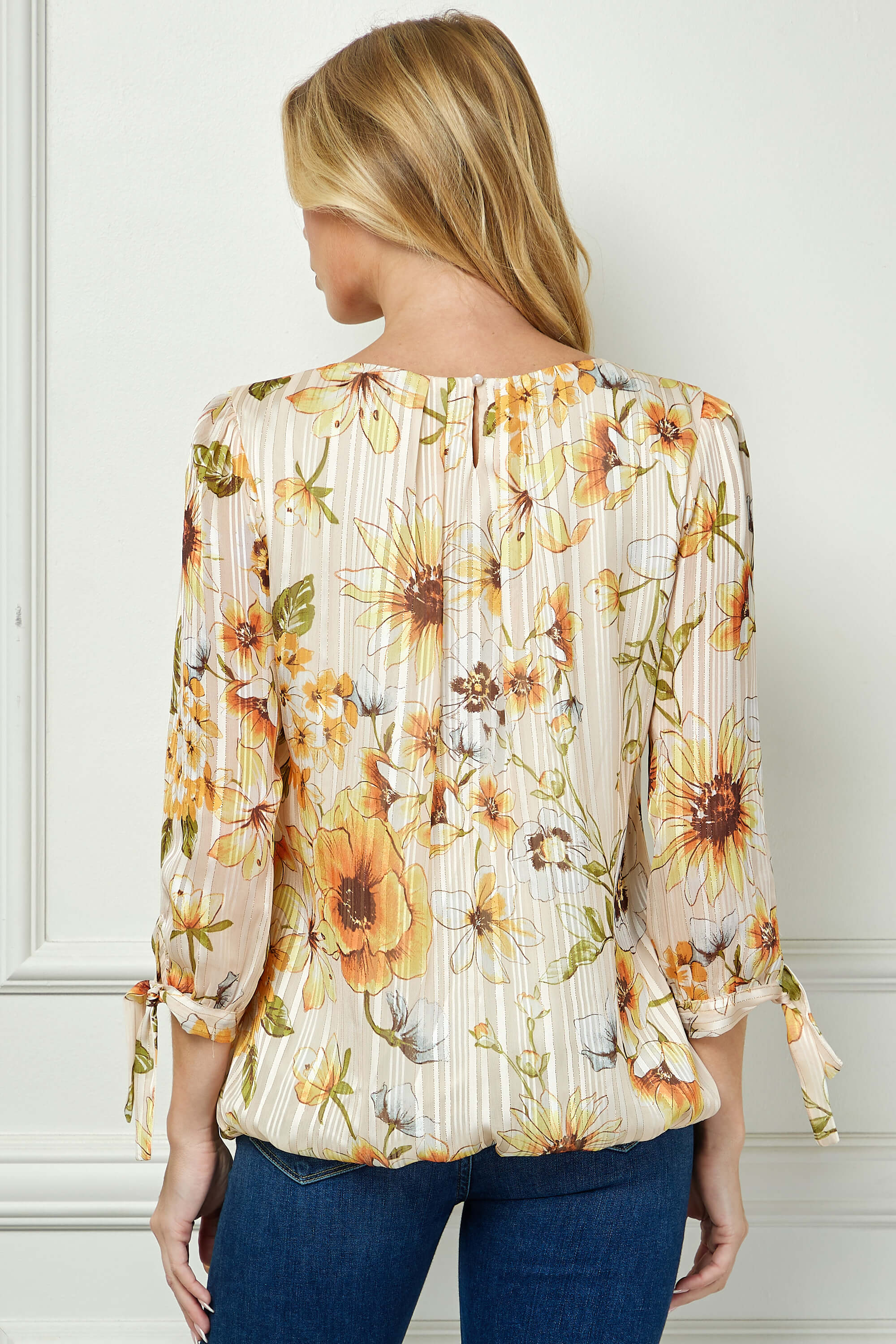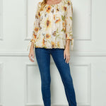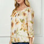 Feminine and effortlessly flattering, this blouse is designed with thoughtful details that elevate everyday style. The softly pleated scoop neckline adds subtle texture and refinement, while the 3/4 sleeves finished with tie accents bring a delicate, adjustable touch.
