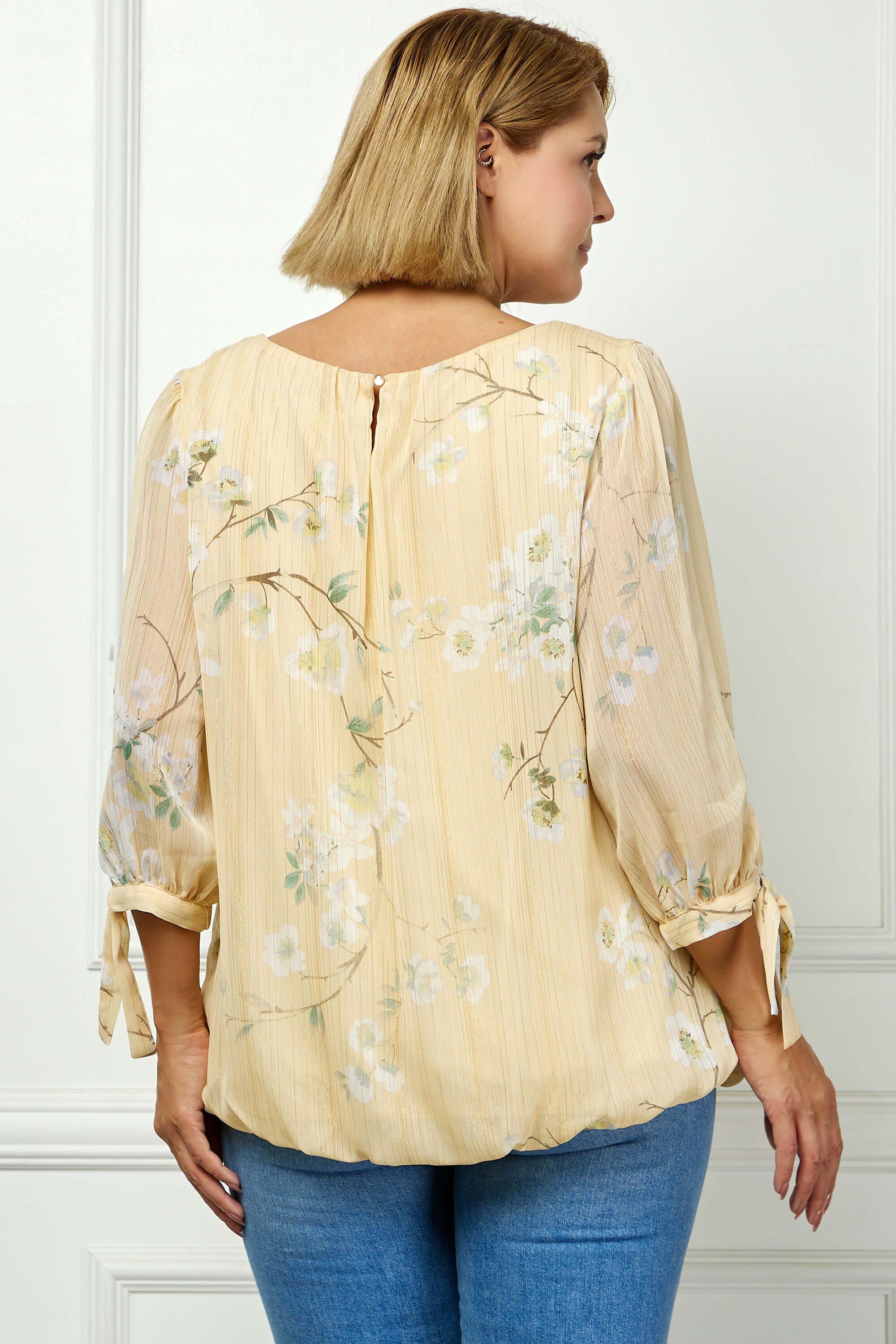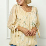 3/4 Tie Sleeve Pleat Neck Bubble Blouse in Yellow - Plus