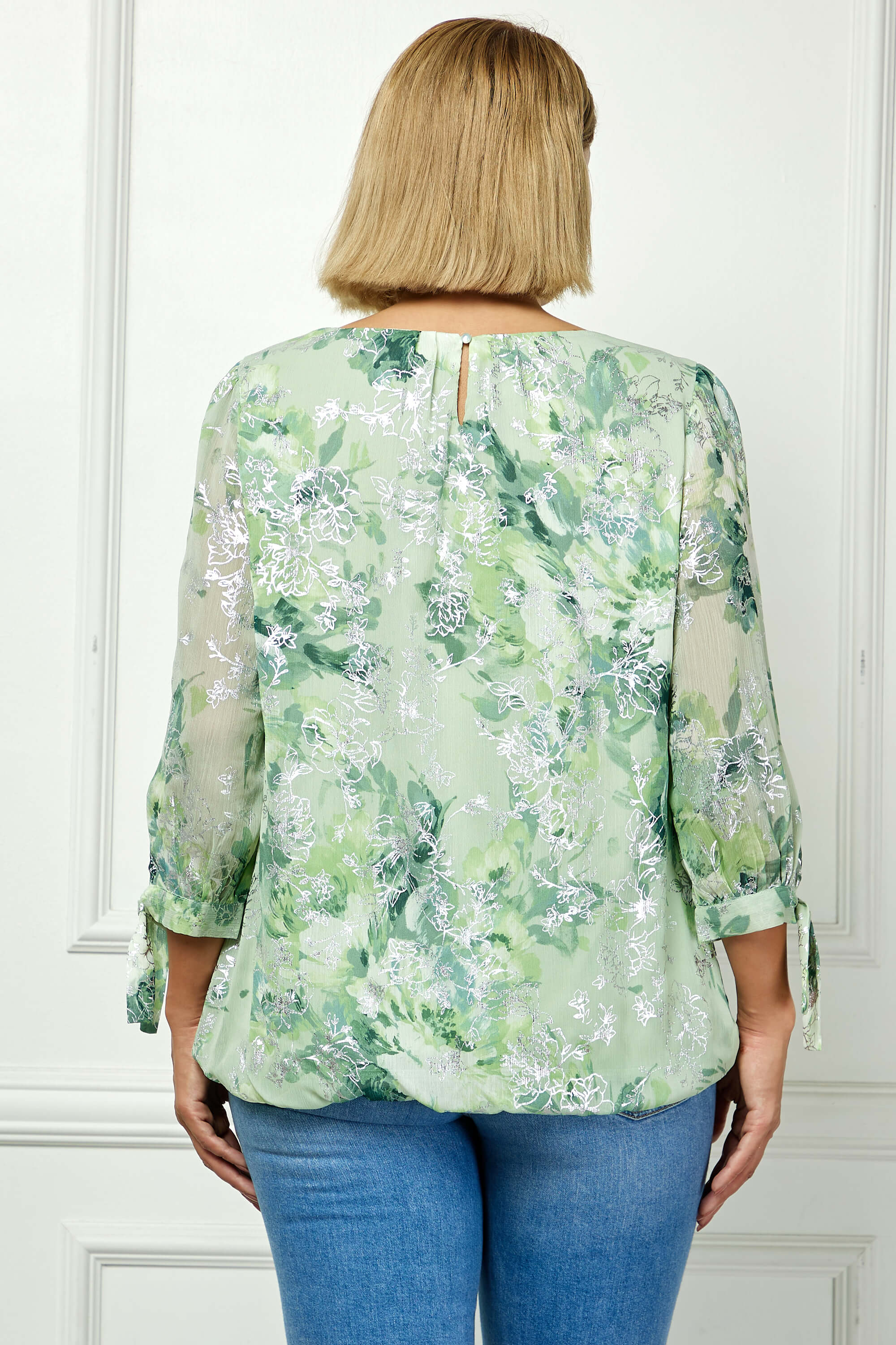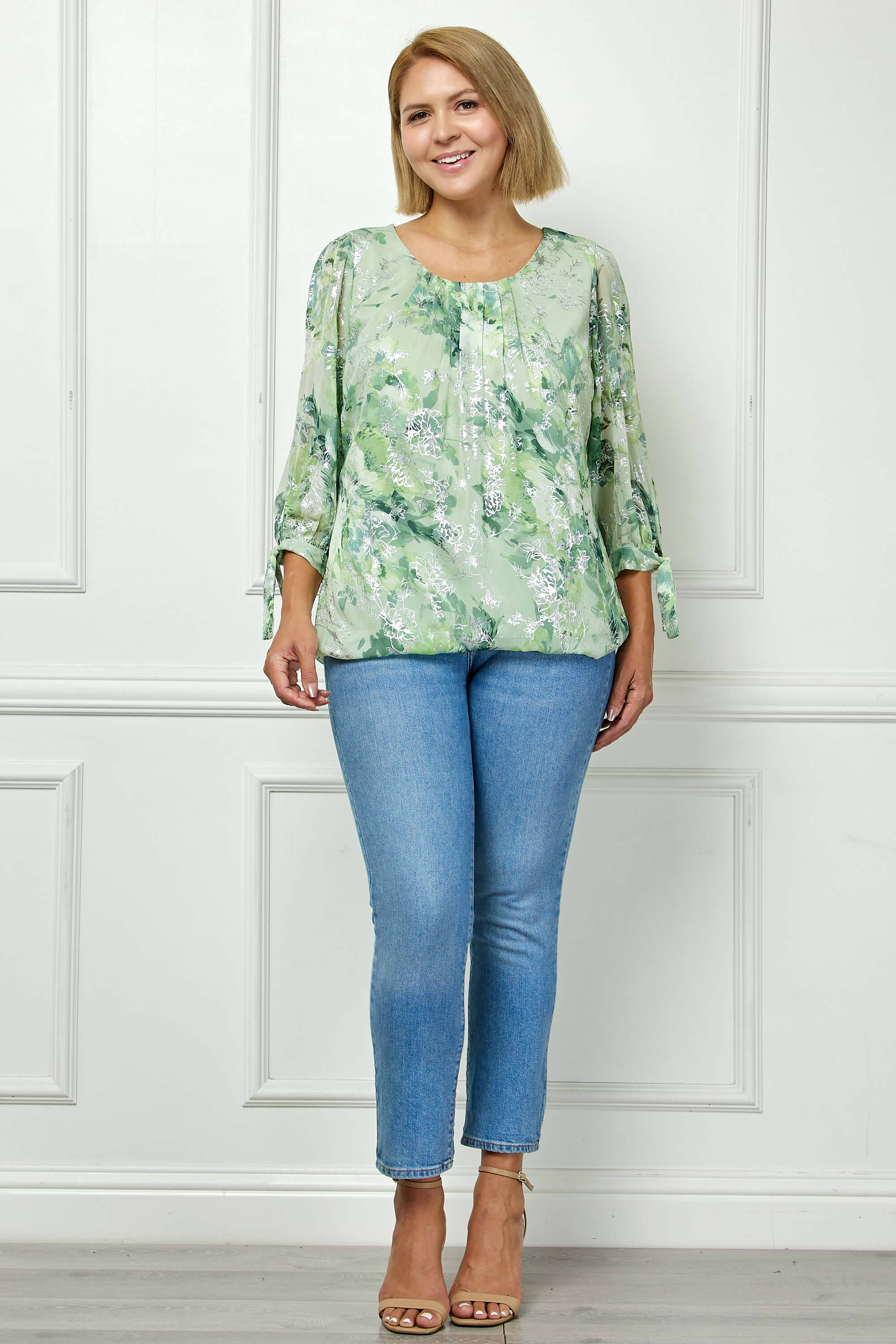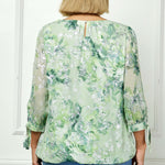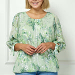 3/4 Tie Sleeve Pleat Neck Floral Foil Bubble Blouse in Sage/Cream Watercolor - Plus