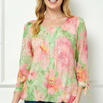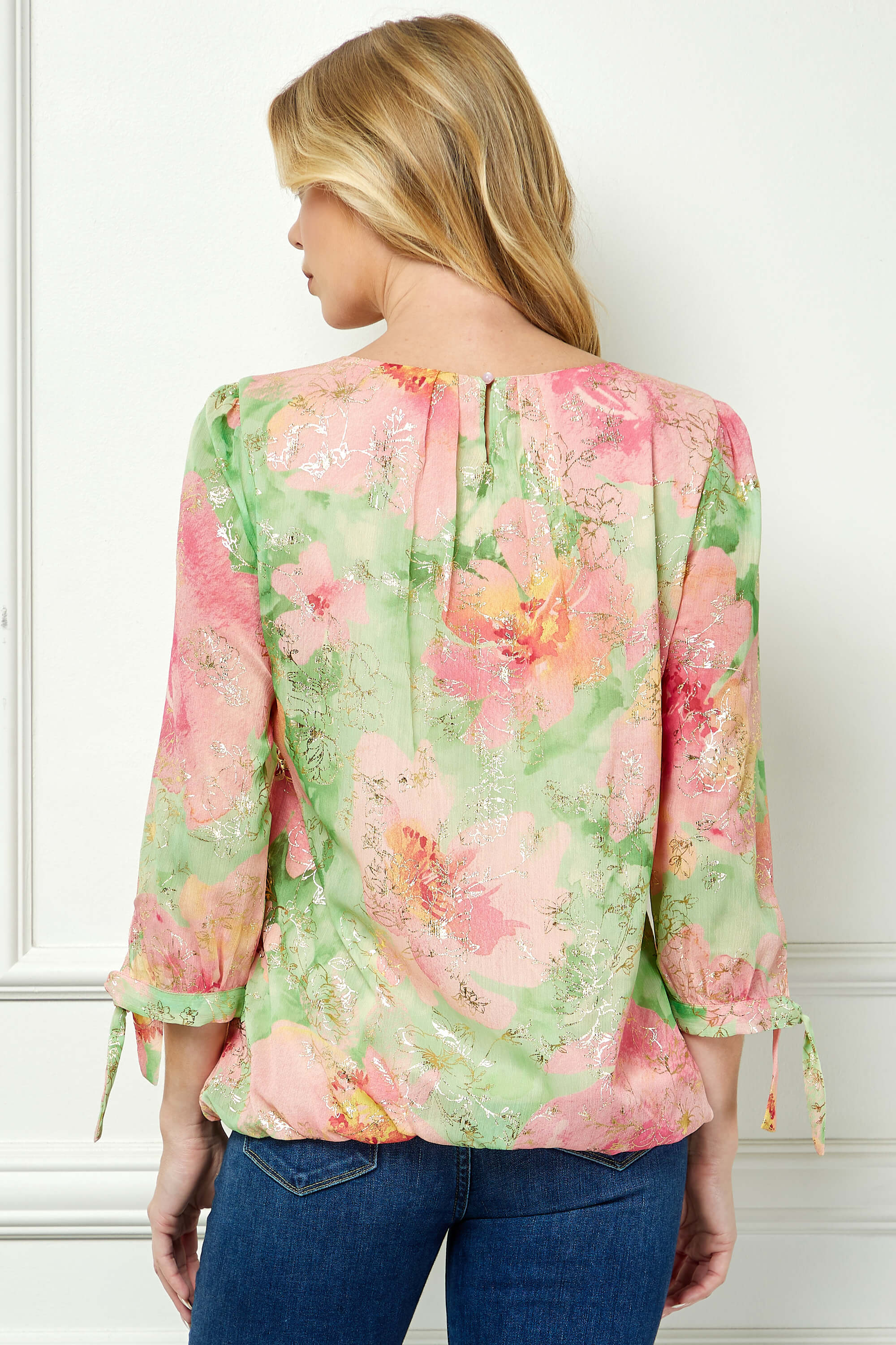 3/4 Tie Sleeve Pleat Neck Floral Foil Bubble Blouse in Sage/Pink Watercolor
