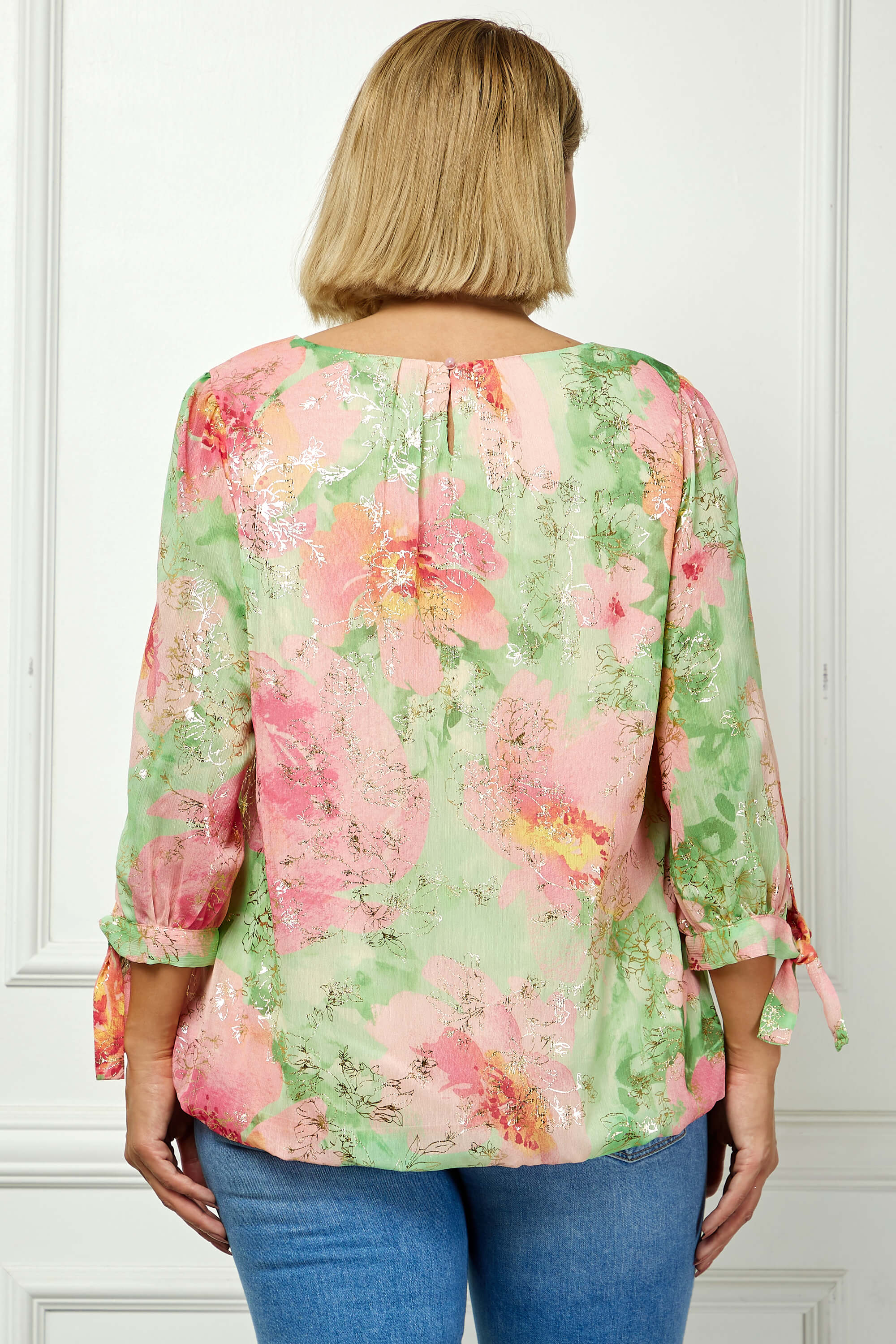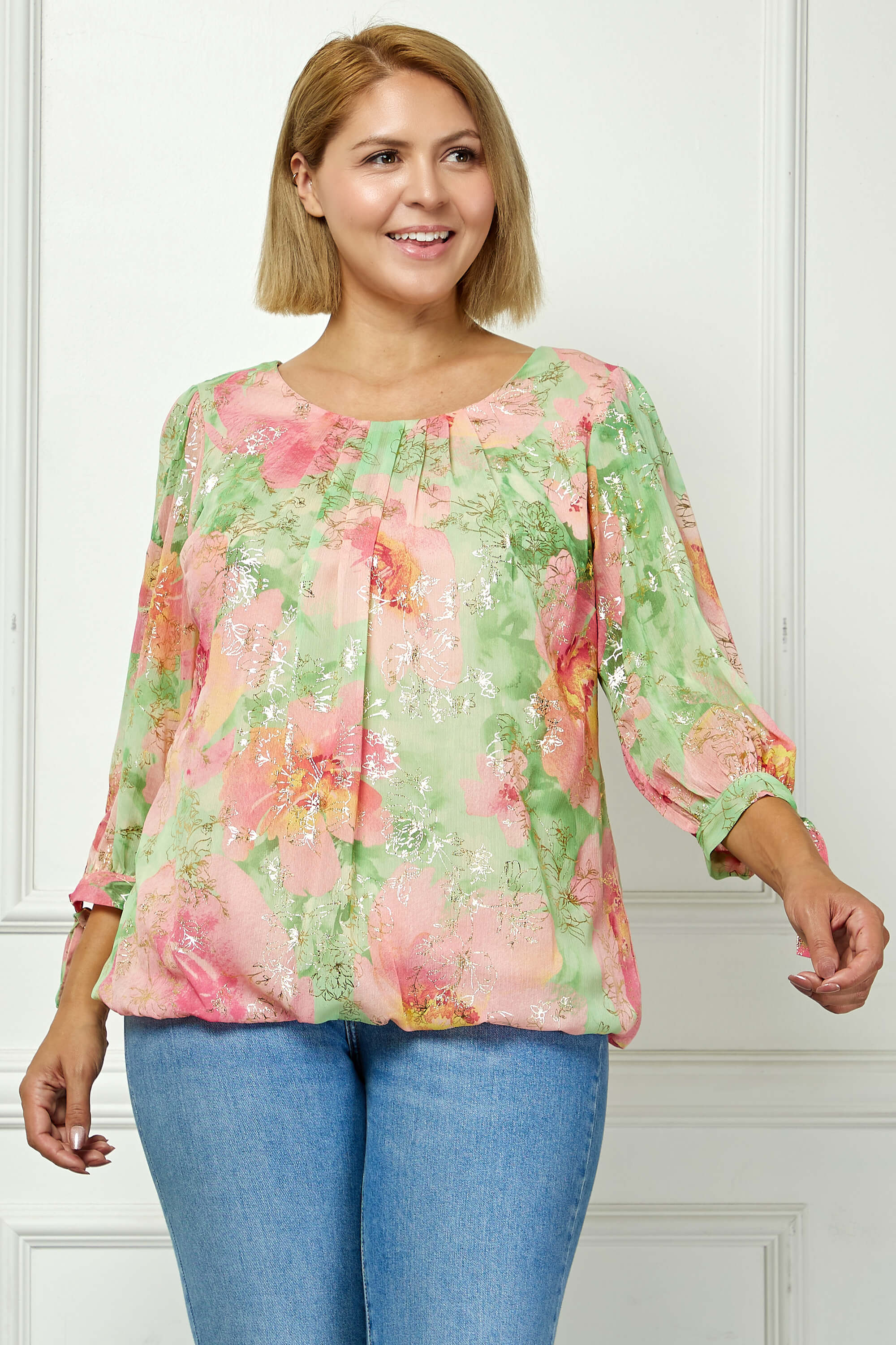 3/4 Tie Sleeve Pleat Neck Floral Foil Bubble Blouse in Sage/Pink Watercolor - Plus