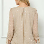 3/4 Tie Sleeve Pleat Neck Foil Bubble Blouse in Beige