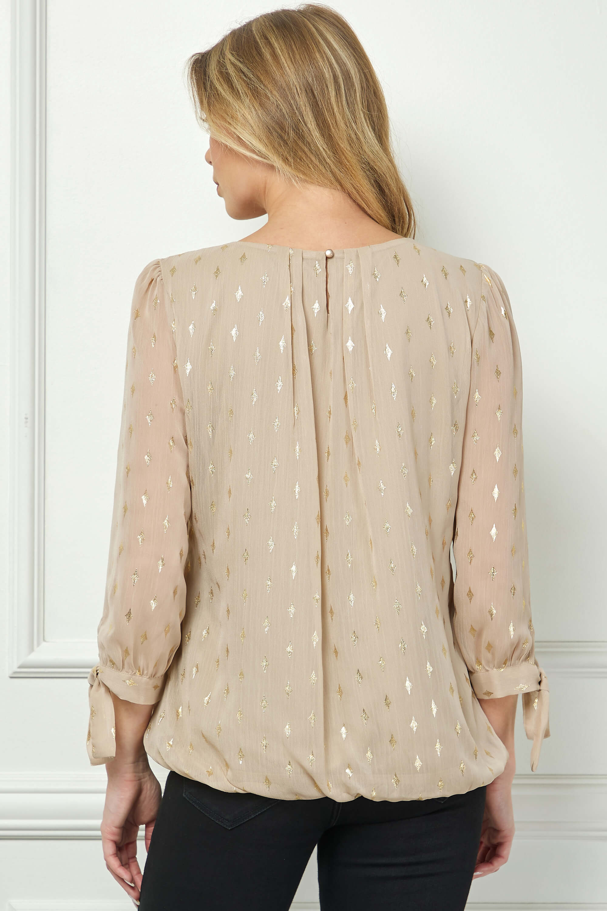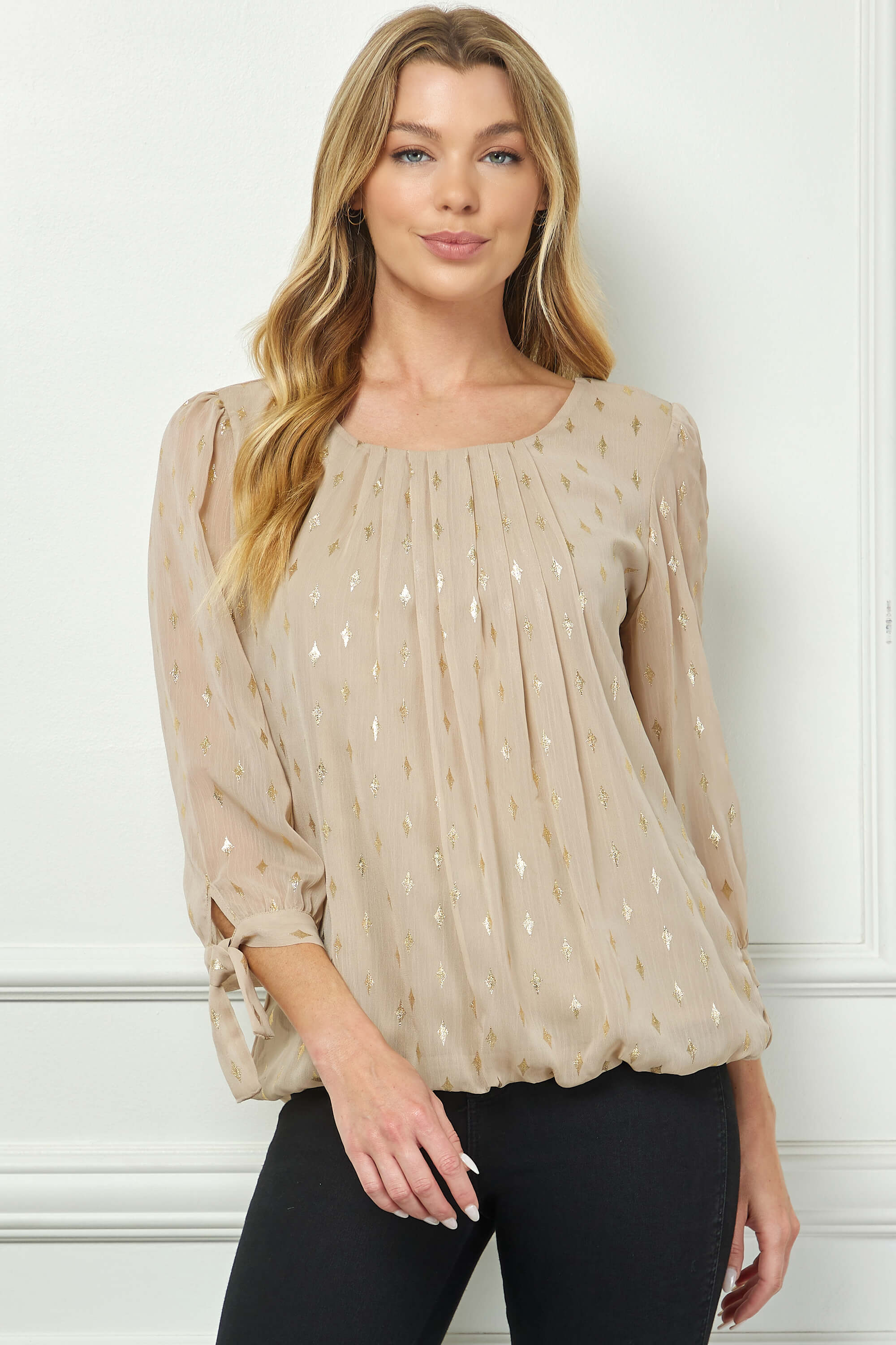 Elevated with subtle shimmer, this blouse blends refined details with an effortlessly flattering fit. The softly pleated neckline adds texture and elegance, while the 3/4 sleeves with tie accents bring a feminine, adjustable touch.