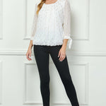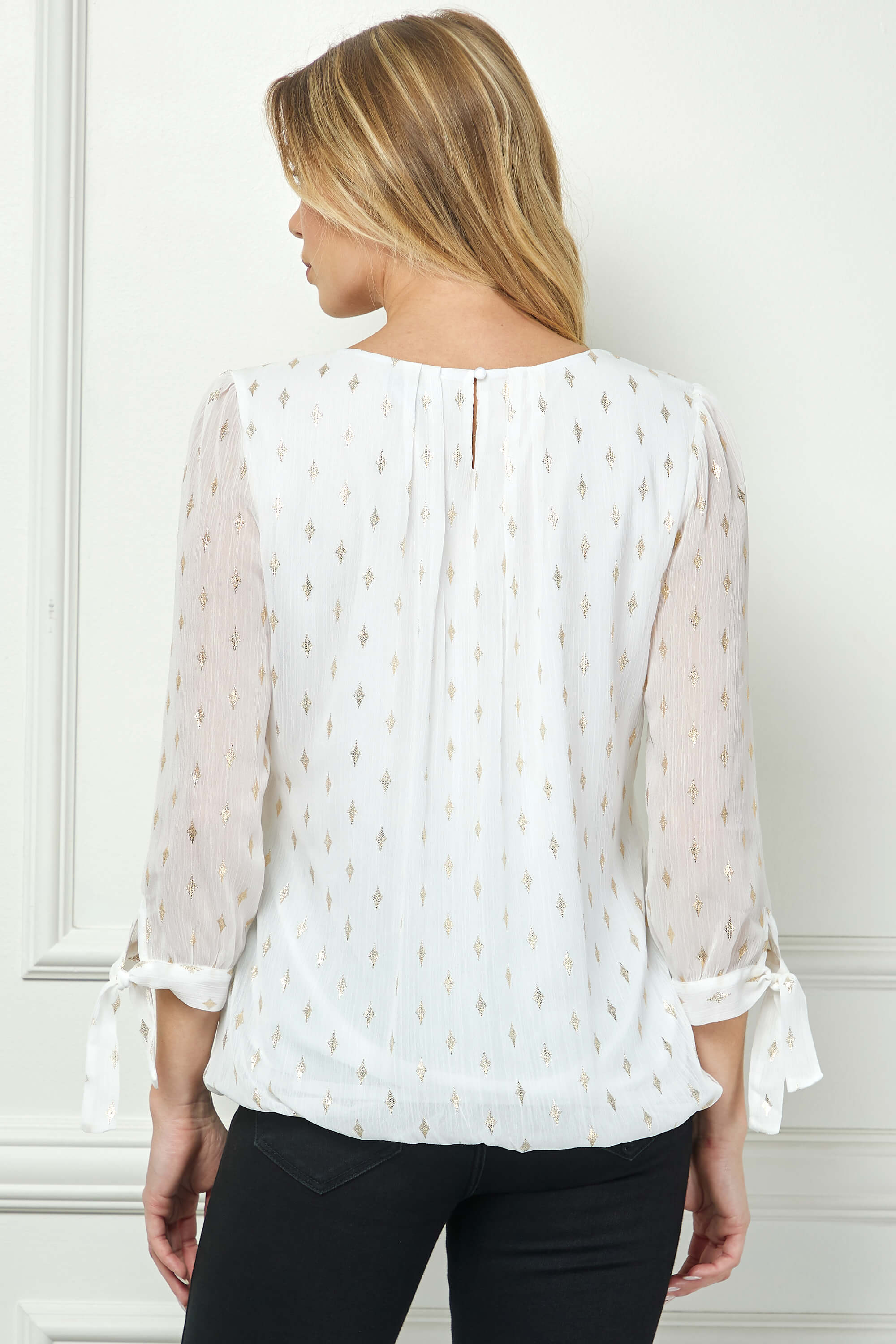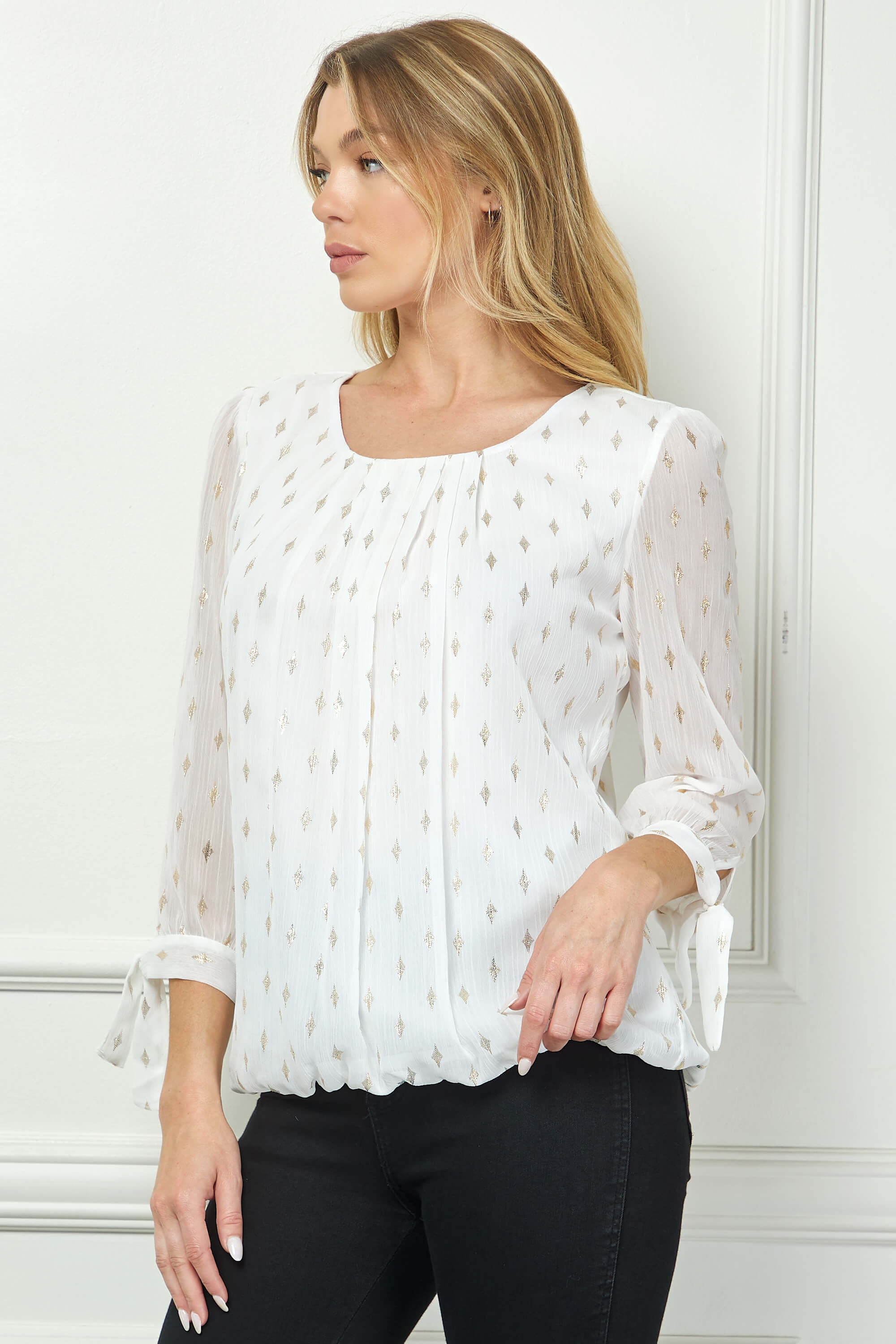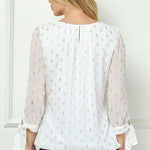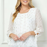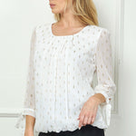 3/4 Tie Sleeve Pleat Neck Foil Bubble Blouse in Ivory/Gold