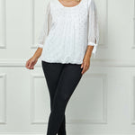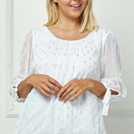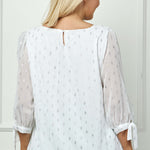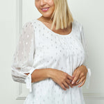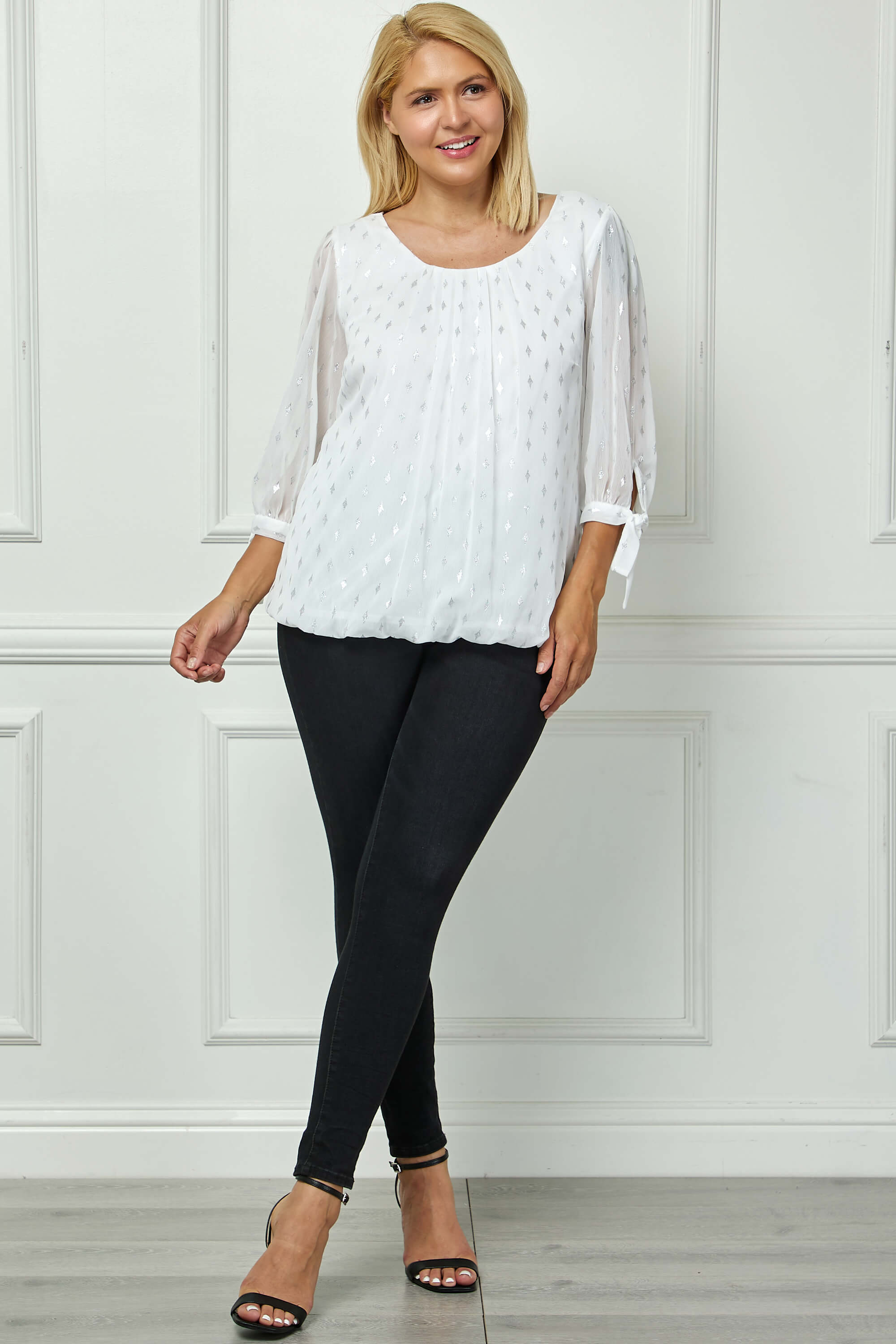 3/4 Tie Sleeve Pleat Neck Foil Bubble Blouse in Ivory/Silver - Plus