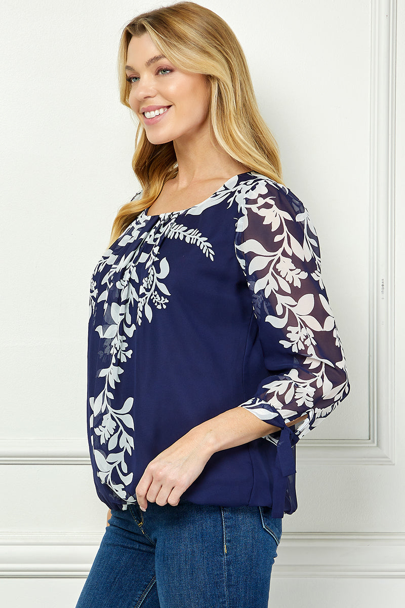 3/4 Tie Sleeve Pleat Neck Placement Print Bubble Blouse in Navy