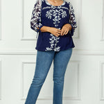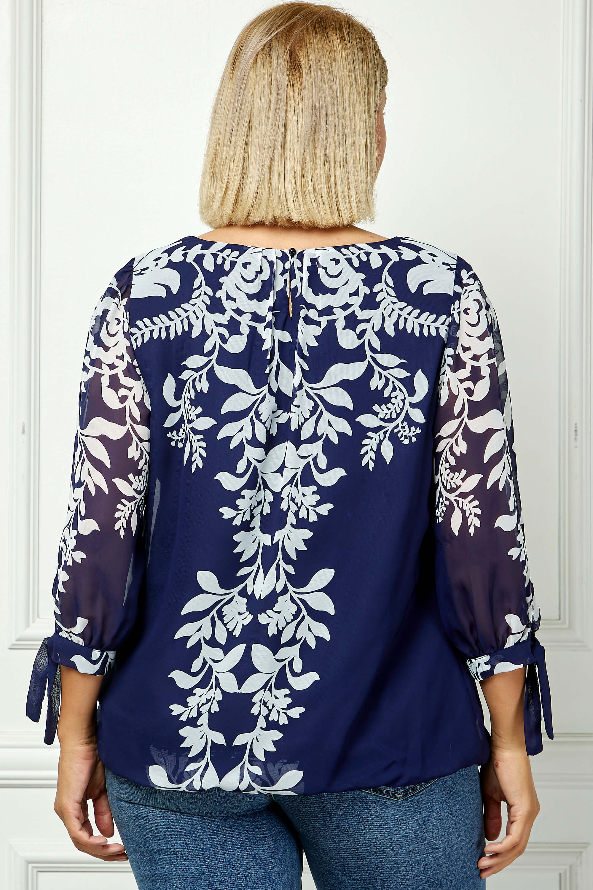 3/4 Tie Sleeve Pleat Neck Placement Print Bubble Blouse in Navy -Plus