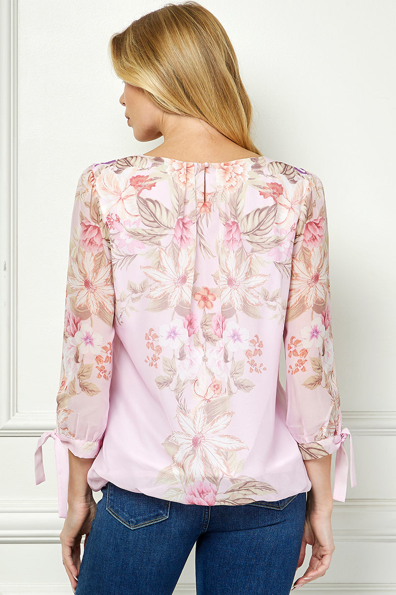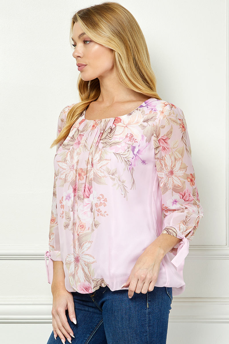 3/4 Tie Sleeve Pleat Neck Placement Print Bubble Blouse in Pink/Melon
