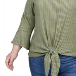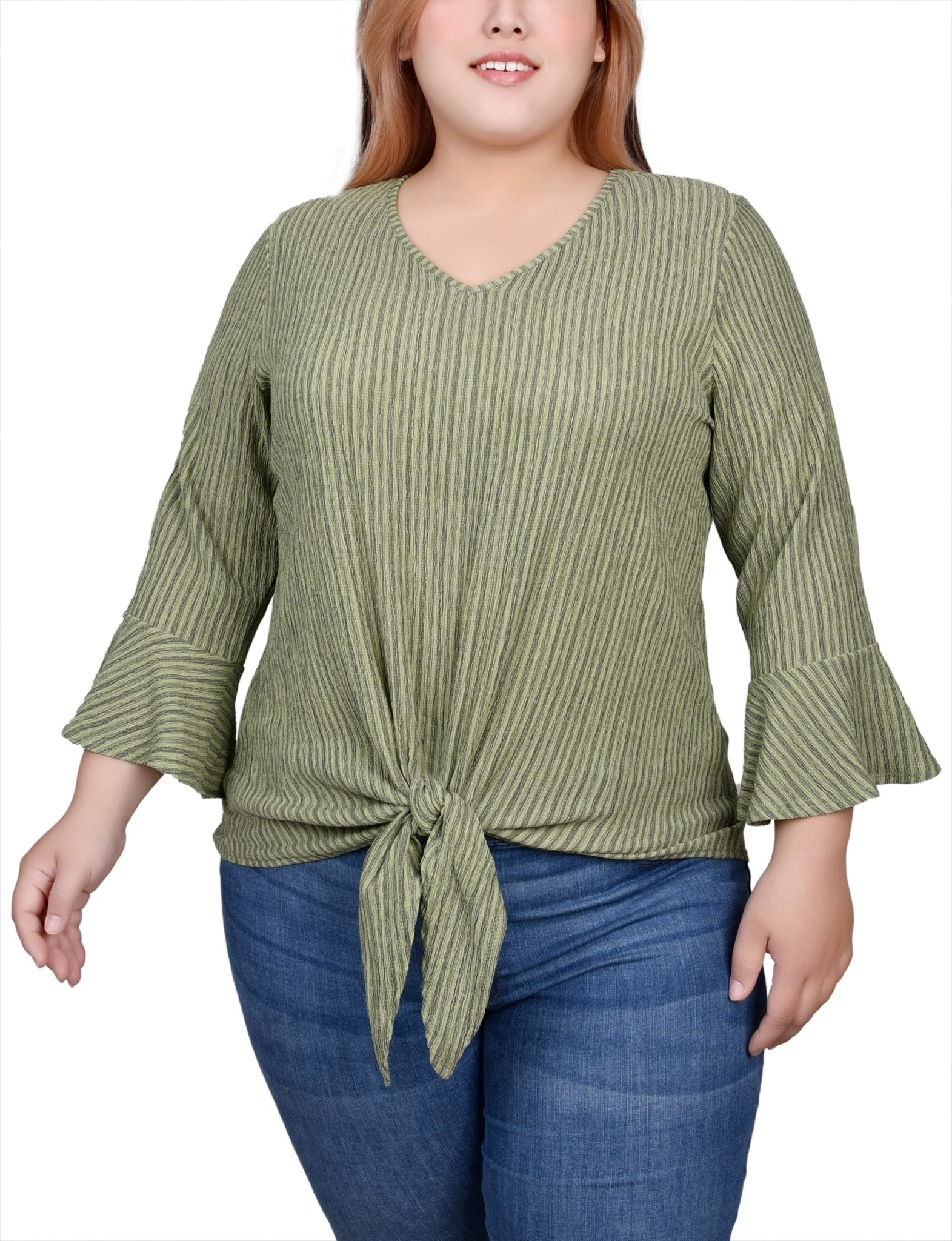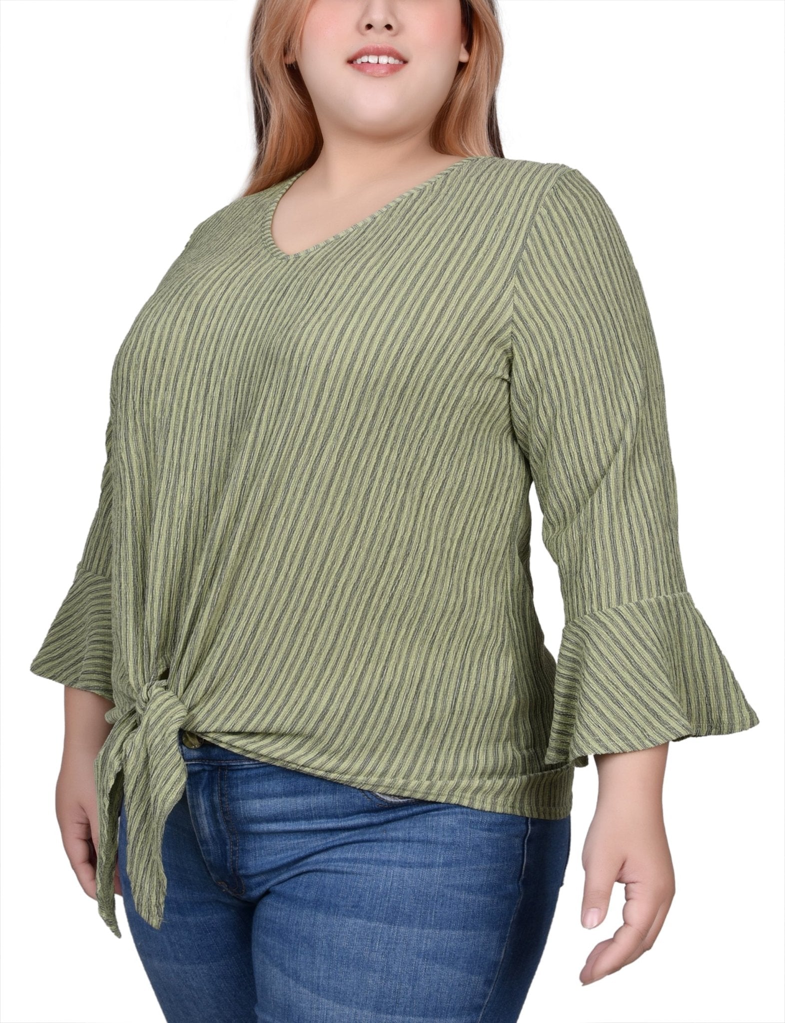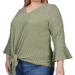 Live life on the fuller side with this comfy, figure-flattering top. Show off your curves with just the right amount of texture and 3/4 bell sleeves. An easy-to-wear v-neck and front tie complete the look, giving you the perfect top for any occasion!