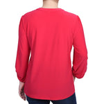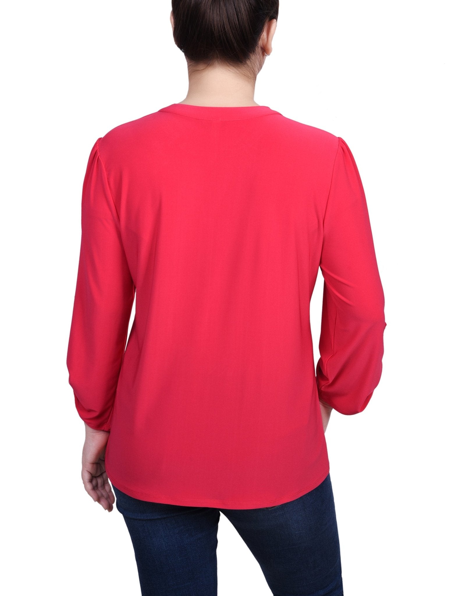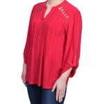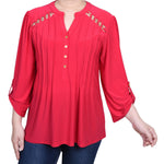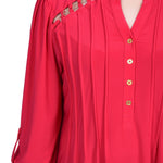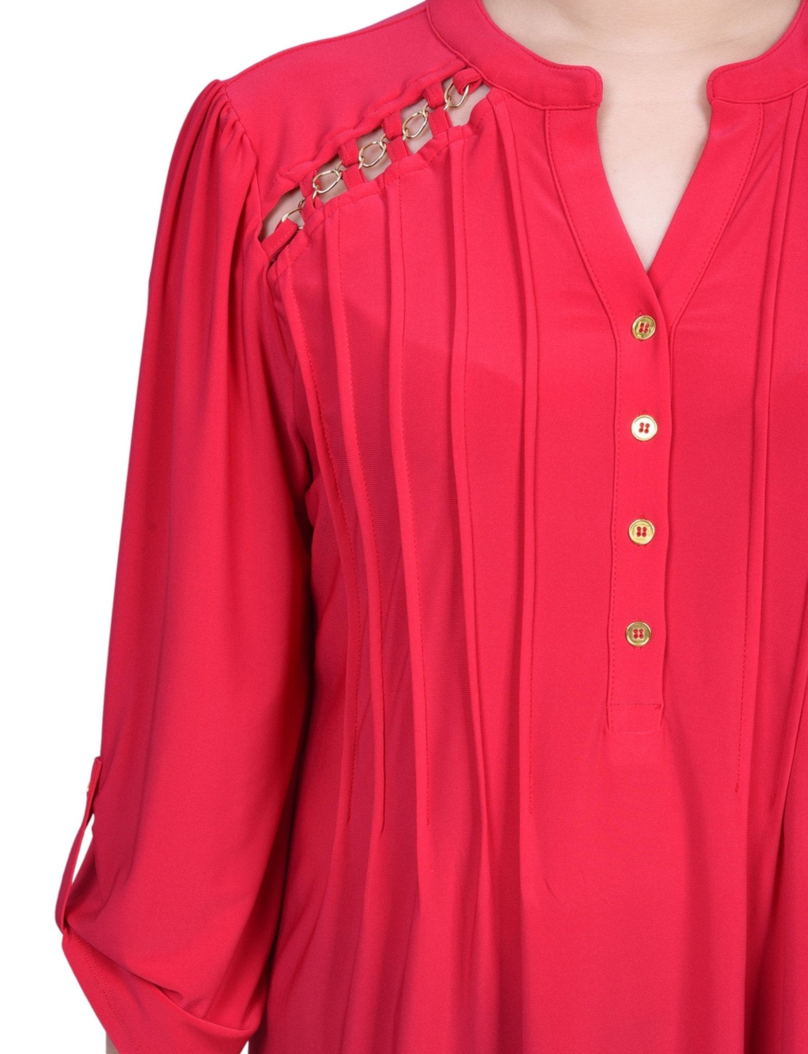 It's all about the details on this jersey knit top. The front shoulders feature cutouts with a chain detail. There are pintucks down the front bodice. There are roll tab sleeves to make this blouse a year-round choice.