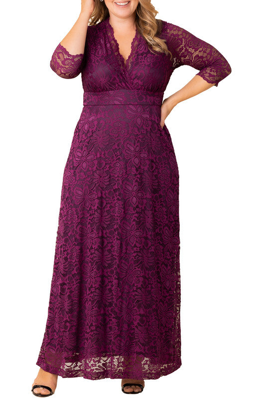 The Maria Lace Evening Gown is a long formal gown crafted from stretch floral scalloped lace and designed with an A-line silhouette, surplice neckline, pockets, and 3/4 sleeves. Perfect for weddings guests, galas, formal events, mother of the bride or groom, and other special occasions and parties