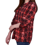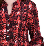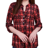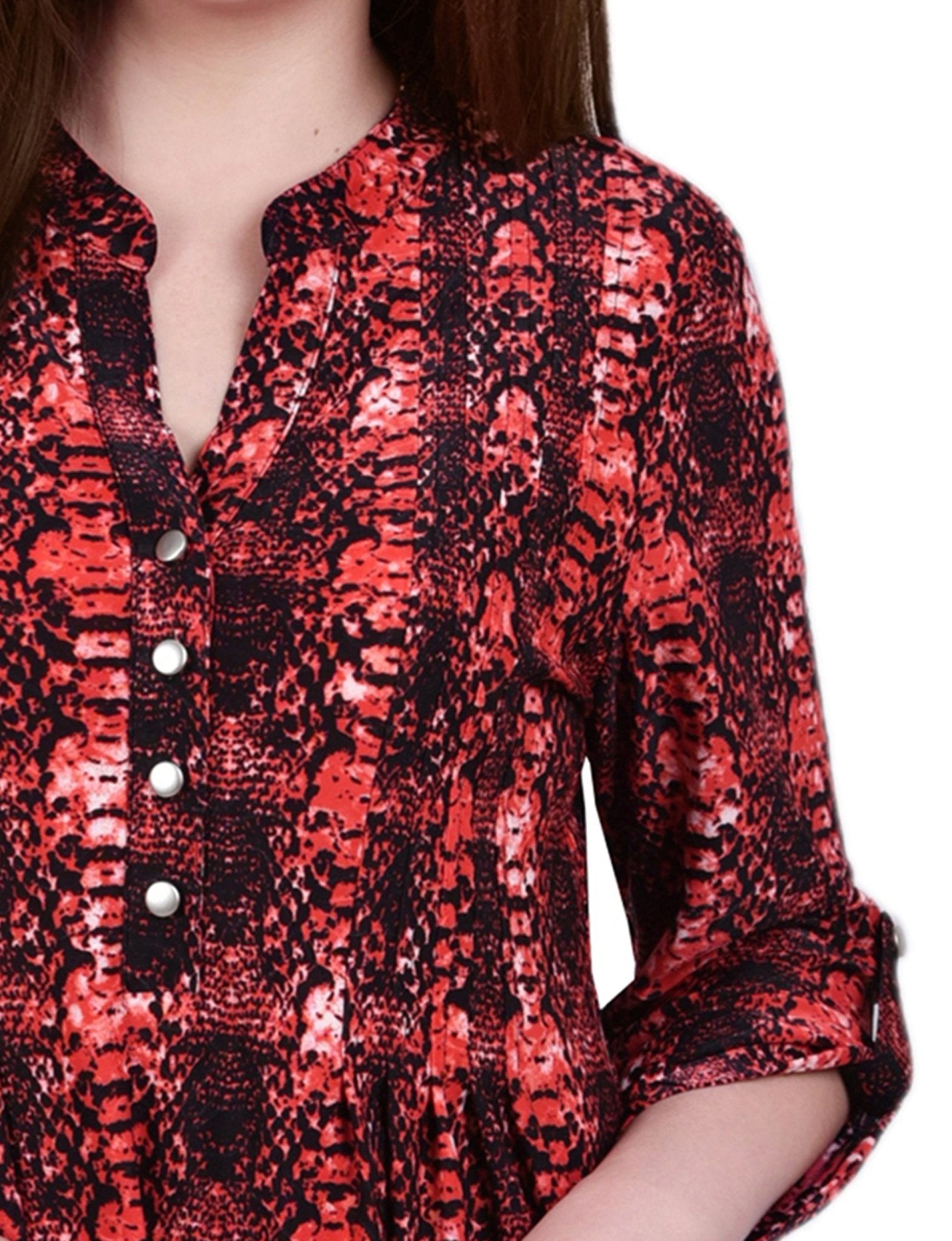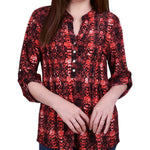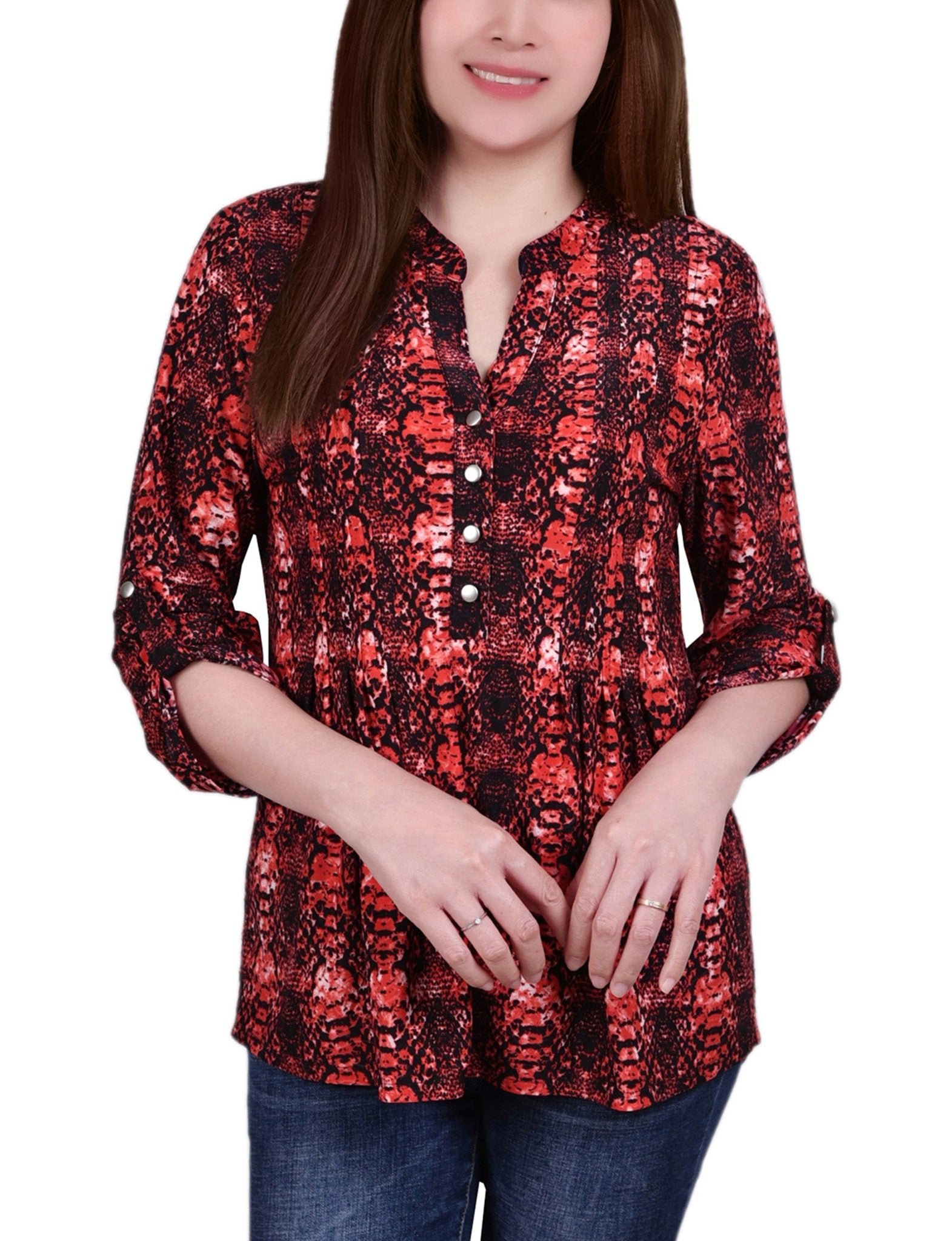 With 3/4 roll tab sleeves and a button up detail, this top is flattering on any woman.