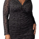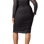 Be the leading lady in this bodycon number inspired by the curve-enhancing style of the 40's and 50's. Ruching throughout the waist and skirt will smooth and enhance your curves to perfection, while the v-neck and the long sleeves are flattering and give the perfect amount of coverage.