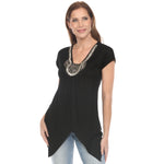 Designed to make a subtle statement, this knit top features a beautifully detailed beaded neckline that adds interest without extra styling. The soft fabric drapes effortlessly, while the angled hem creates a flattering silhouette with a touch of movement. Pair it with denim or leggings for a look that’s both relaxed and pulled-together—an easy option for day-to-night dressing.