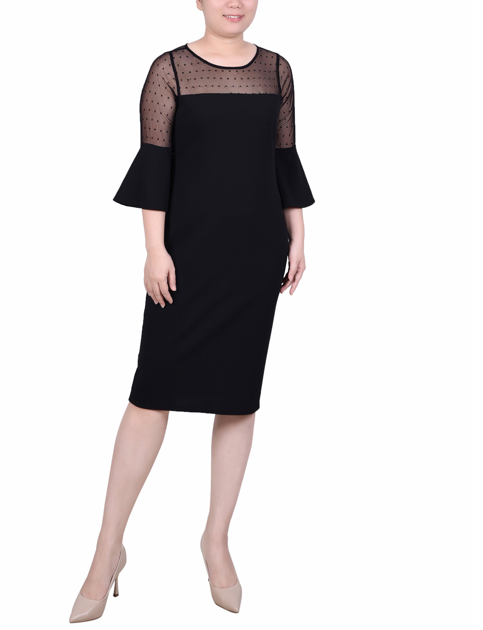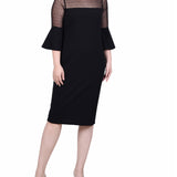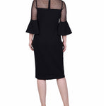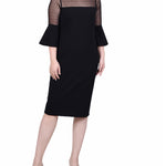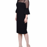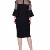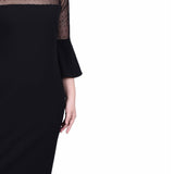 Get ready for your special evening in this illusion neck and sleeve dress. The bell sleeves add extra drama.