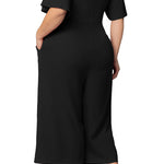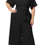 Step into effortless elegance with the Evelyn Cropped Wide Leg Jumpsuit. Designed to flatter your curves, this plus size jumpsuit features a surplice V neckline, a wide waistband with tie detailing, and short flutter sleeves. The cropped wide-leg pants, complete with pockets and a pin tuck down the front, offer a tailoBLK yet relaxed fit.