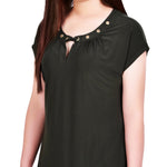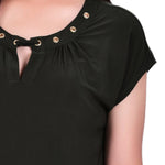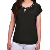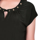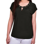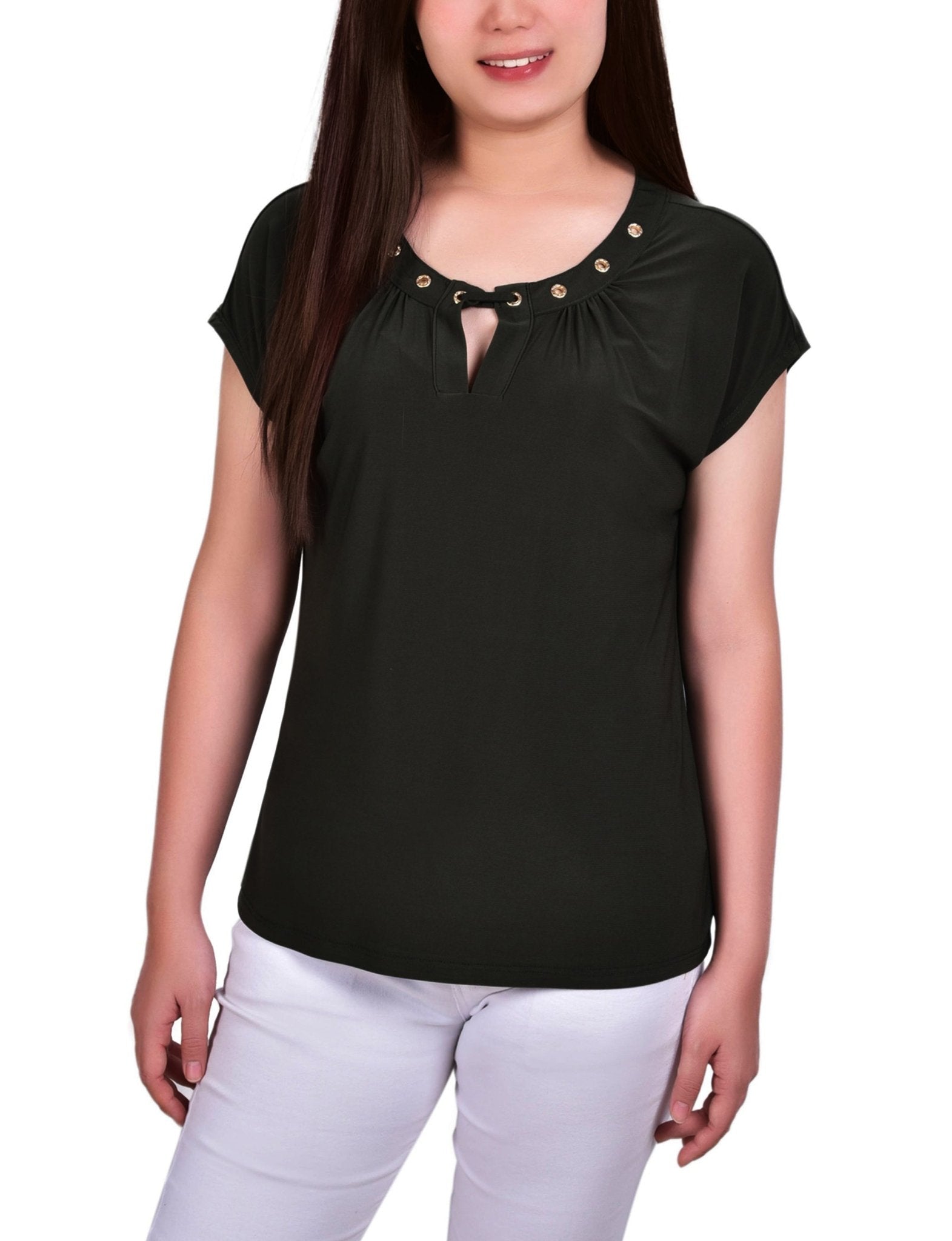 With a neckline grommet accents and cap sleeves, this top is a great addition to any wardrobe.