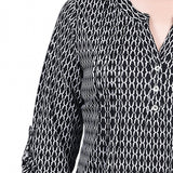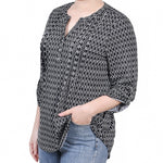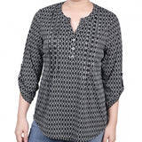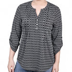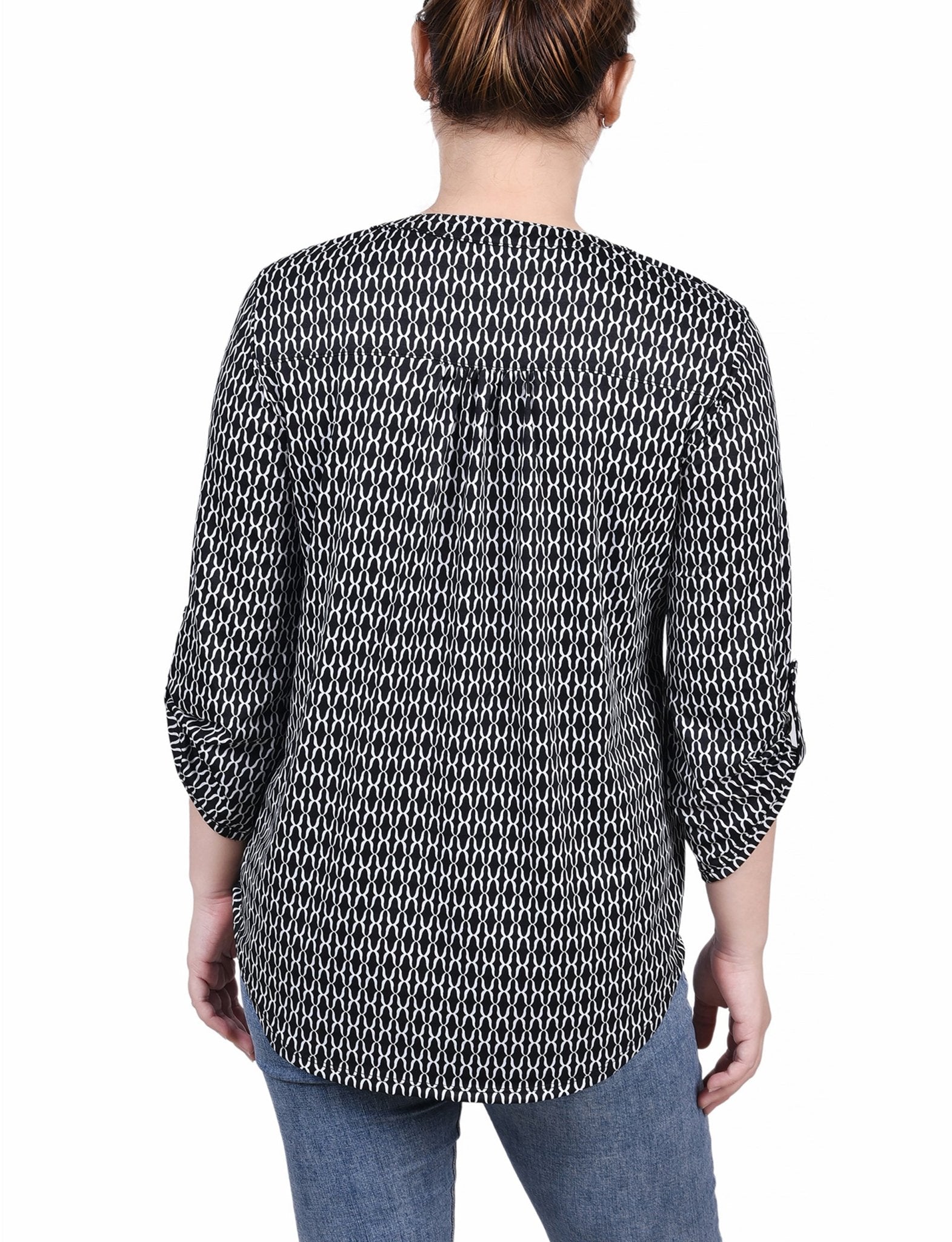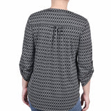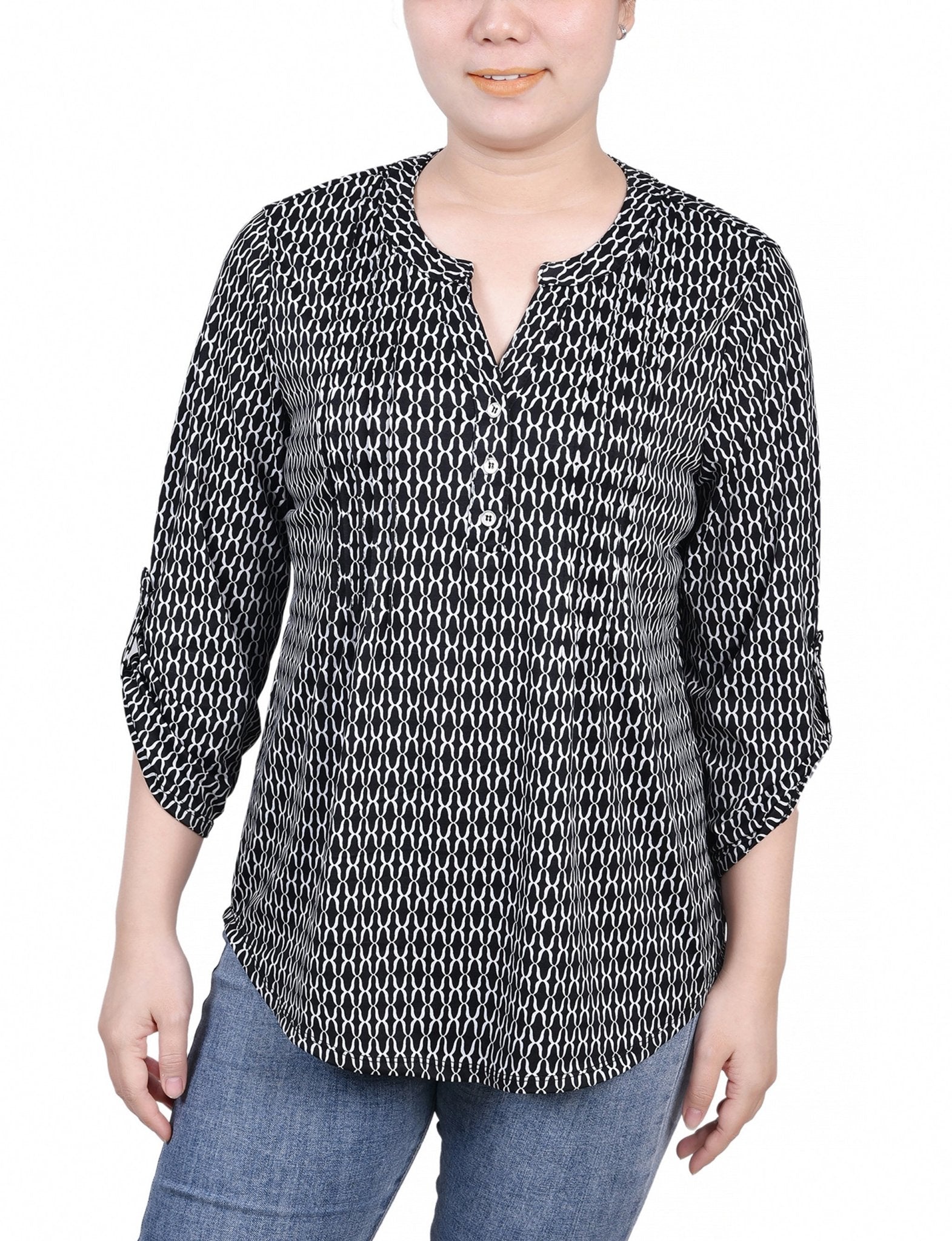 Black White Justin 3/4 Roll Tab Sleeve Y Neck Top - Petite
