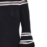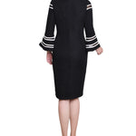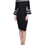 This is a sophisticated black midi dressfeatures a body-skimming silhouette and long sleeves with flared cuffs. It is accented with horizontal white stripe details at the upper chest and sleeve ends, adding a modern, graphic touch.