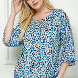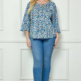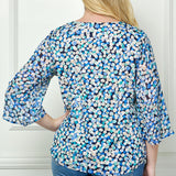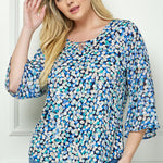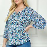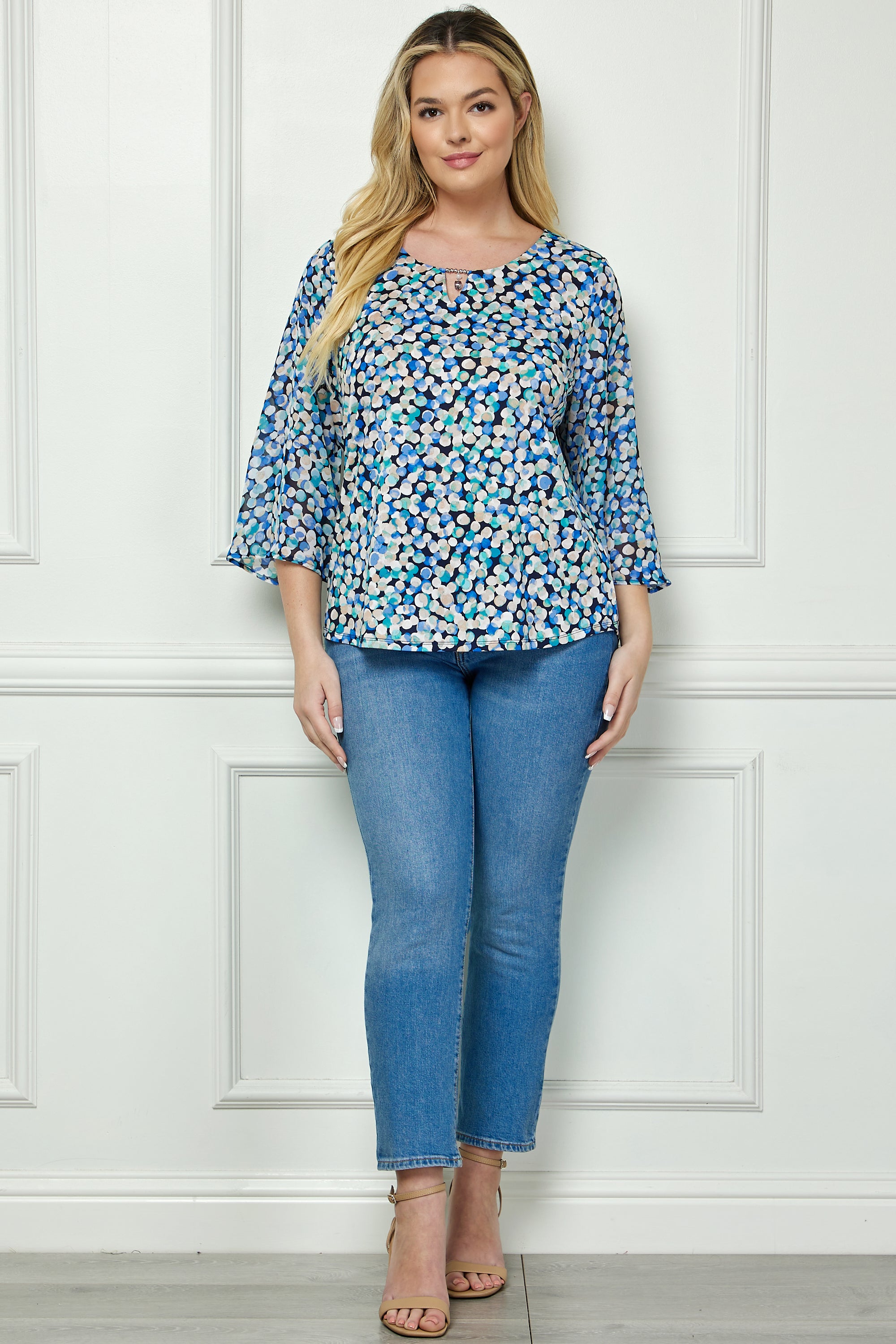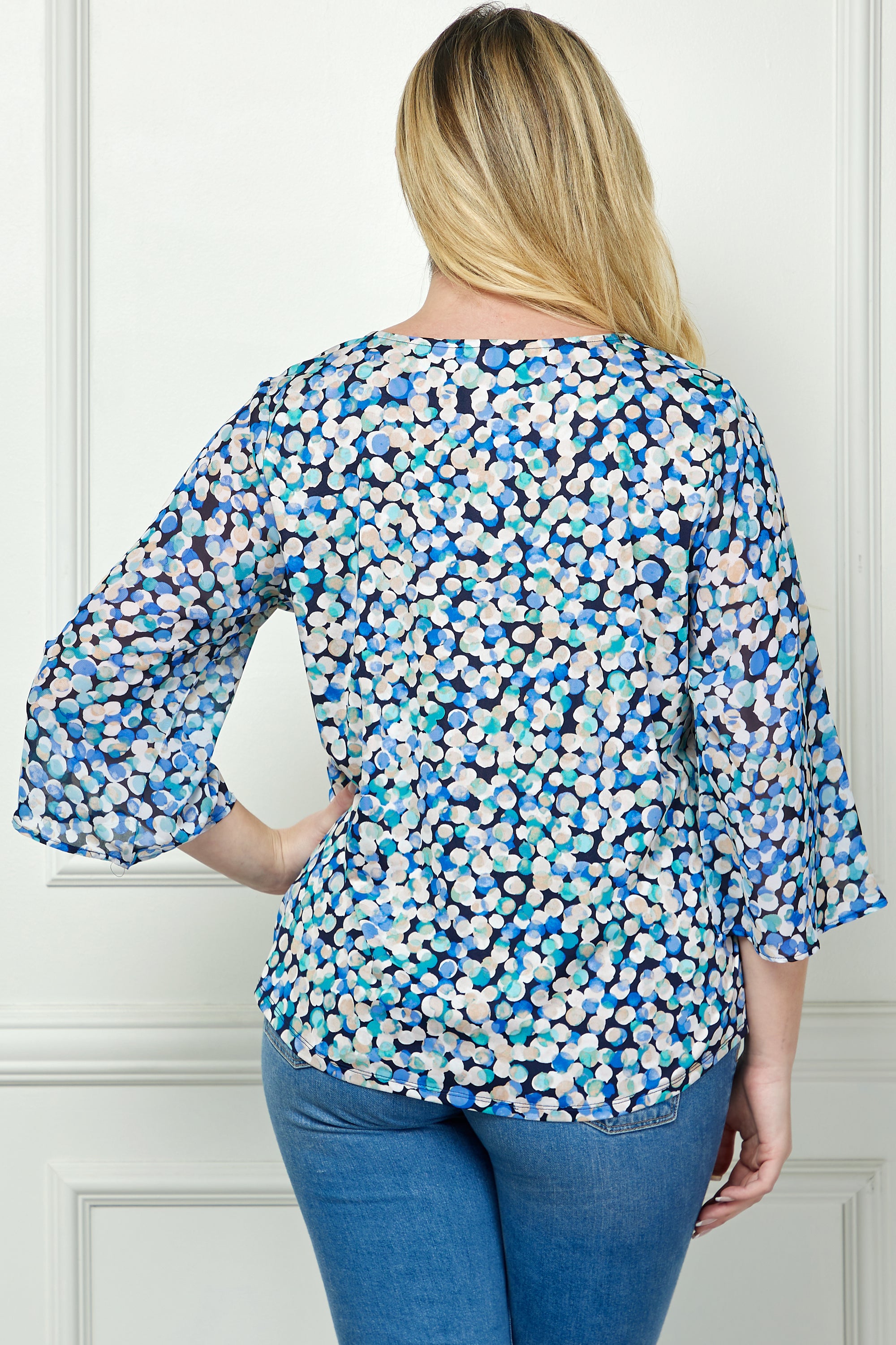 3/4 Bell Sleeve Cutout Keyhole Trim Front Neck Mix Media Blouse in Print DTY Bodice + Print Chiffon Sleeves, with beautiful Print & color that makes it a great top to wear for day or night.