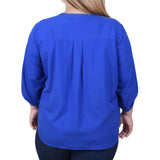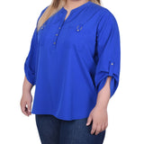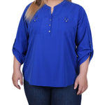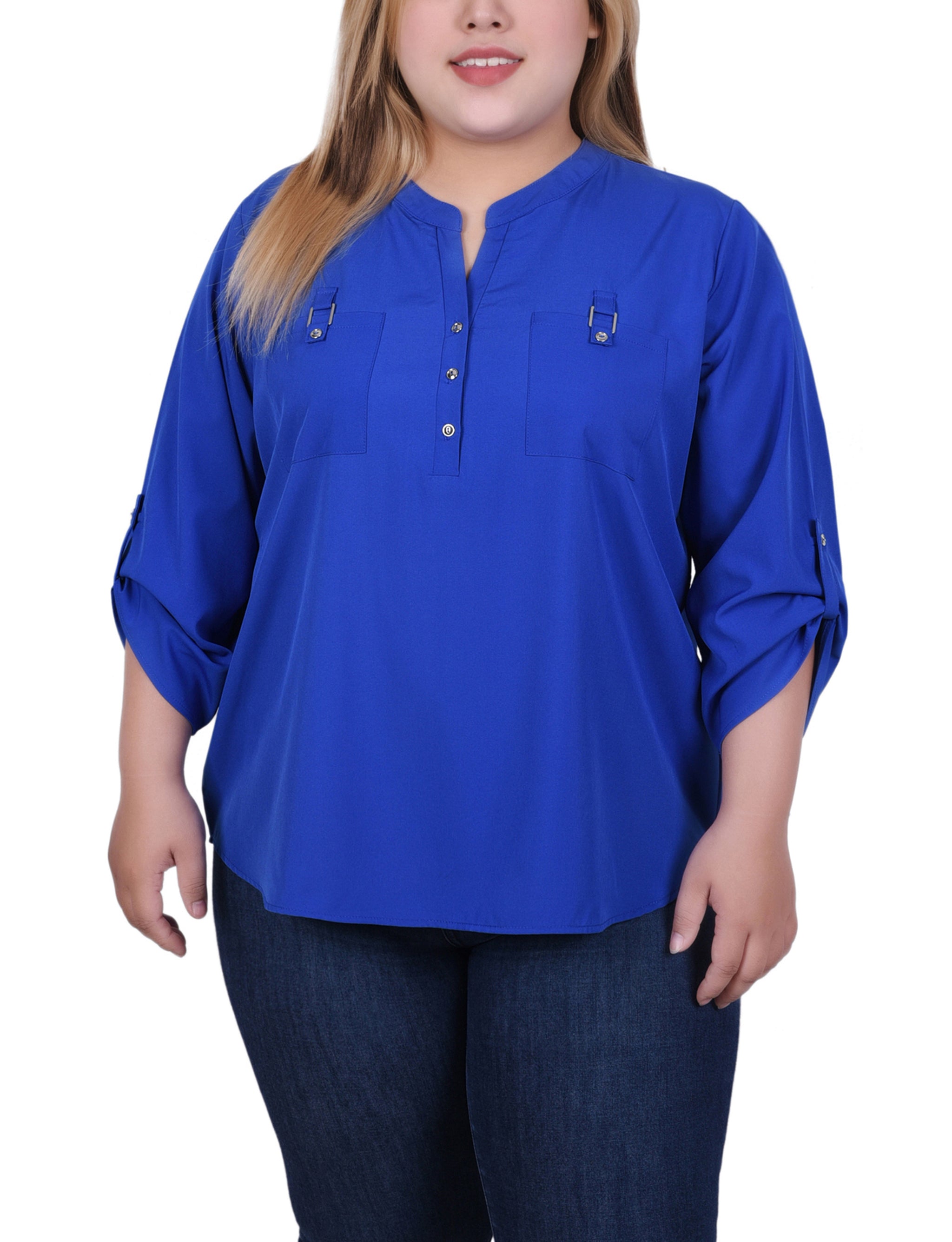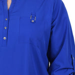 It's all about the details on this blouse. The pockets feature square hardware and buttons. There are roll tab sleeves to make this blouse a year-round choice.