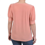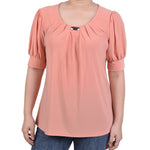 Add a little flair to your day with this puff sleeve knit top with wide cuffs and neck hardware. You can pair this top with your favorite jeans for a more casual look. You can pair it with a pair of dress pants or skirt for work. You can even dress it up for the evening! The fabric is a soft knit jersey and can be thrown into the washer and dryer for an easy-care piece that will last from season to season.