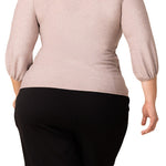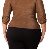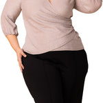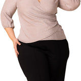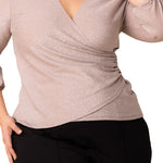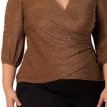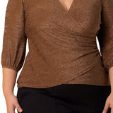 Make an unforgettable entrance in the Plus Size Celeste Faux Wrap Top, a dazzling choice for any special occasion. This sparkly blouse features a flattering surplice neckline, elegant lantern sleeves with elastic cuffs, and subtle shirring at the left side seam for a curve-enhancing fit.