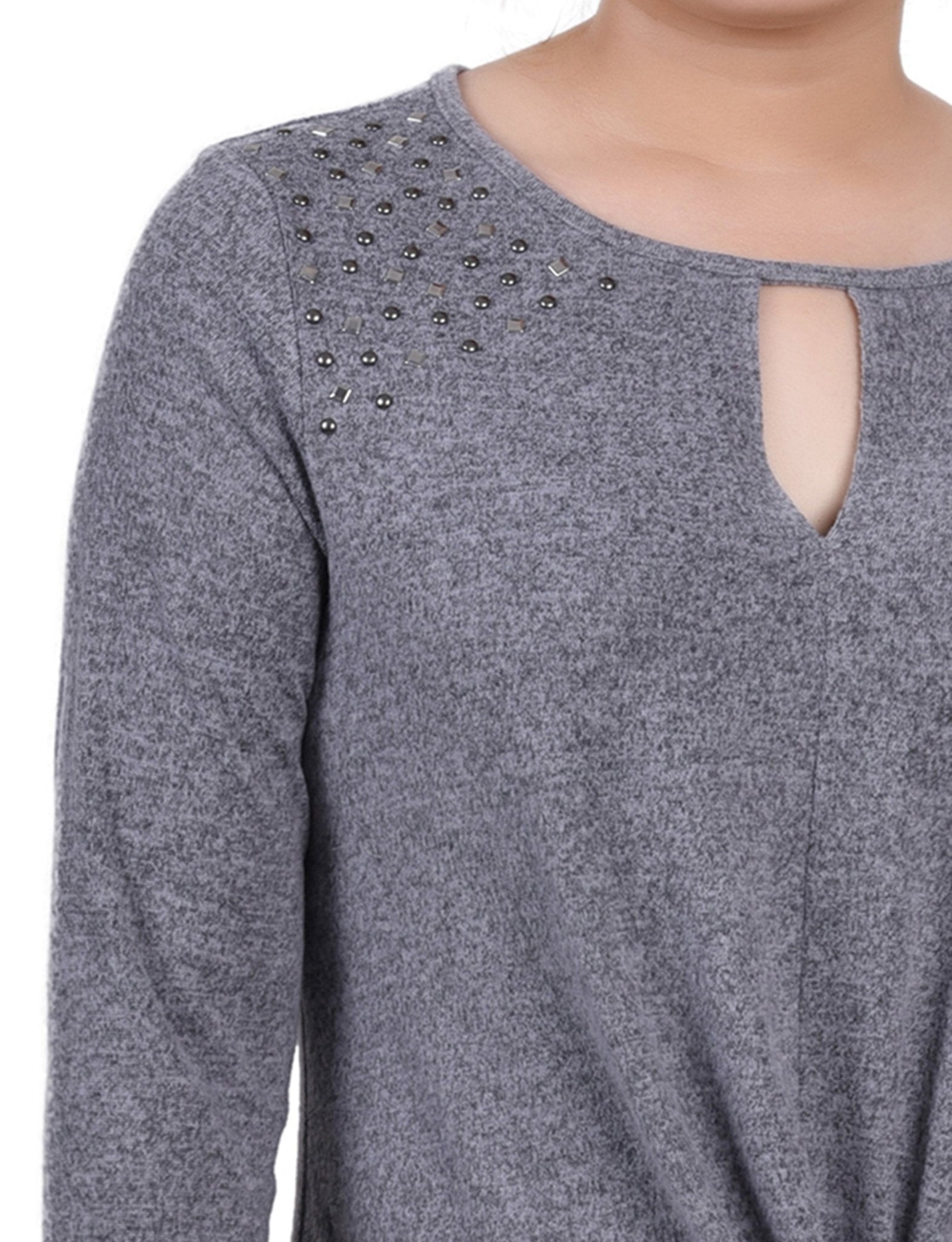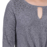 Charcoal Long Sleeve Knit Keyhole Top With Studs - Petite
