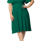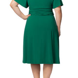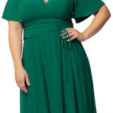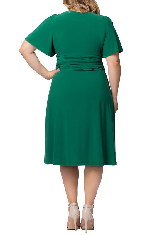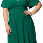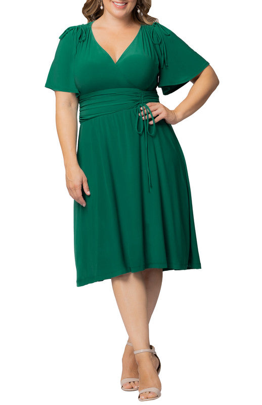 Transition seamlessly from day to night with the Plus Size Jemma Ruched Tie Dress. This elegant knee-length dress features a flattering surplice V neckline and elbow-length flutter sleeves, perfect for work events and dinner dates. Adjustable drawstring tie details at the waistband and shoulders allow for customizable ruching, ensuring a flattering fit that highlights your curves.
