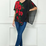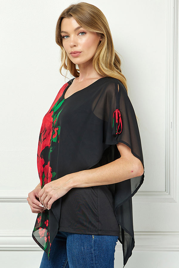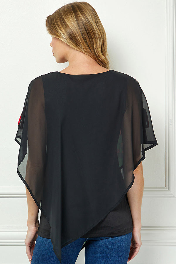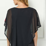 Effortlessly elegant and uniquely detailed, this blouse offers a flattering layered look with a modern twist. The poncho-style overlay drapes beautifully over an attached tank, creating a fluid silhouette that moves gracefully with every step.