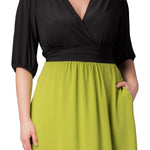 Modern and effortlessly flattering, the Danica Maxi Dress blends comfort with polished style through its chic color-blocked design. Ideal for workdays, date nights, cocktail parties, and wedding guest moments, this unlined dress features a stretch knit bodice with a surplice V-neckline and a softly shirred waistband to define the waist with ease. Short balloon sleeves add a feminine touch, while the flowing woven skirt is finished with side pockets and a ruffle hem for graceful movement.
