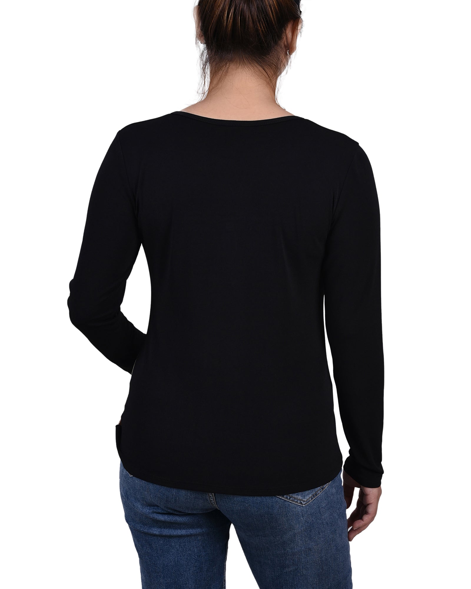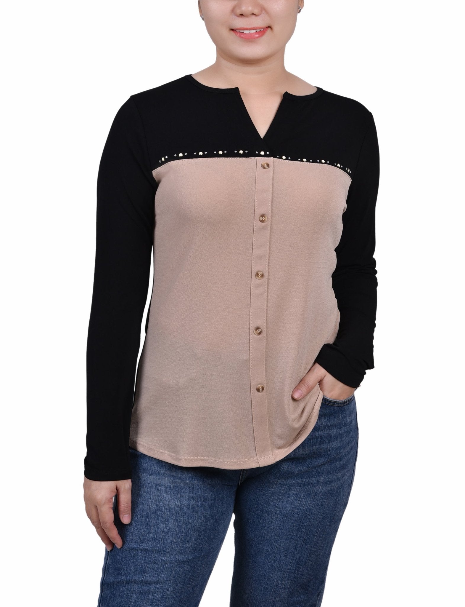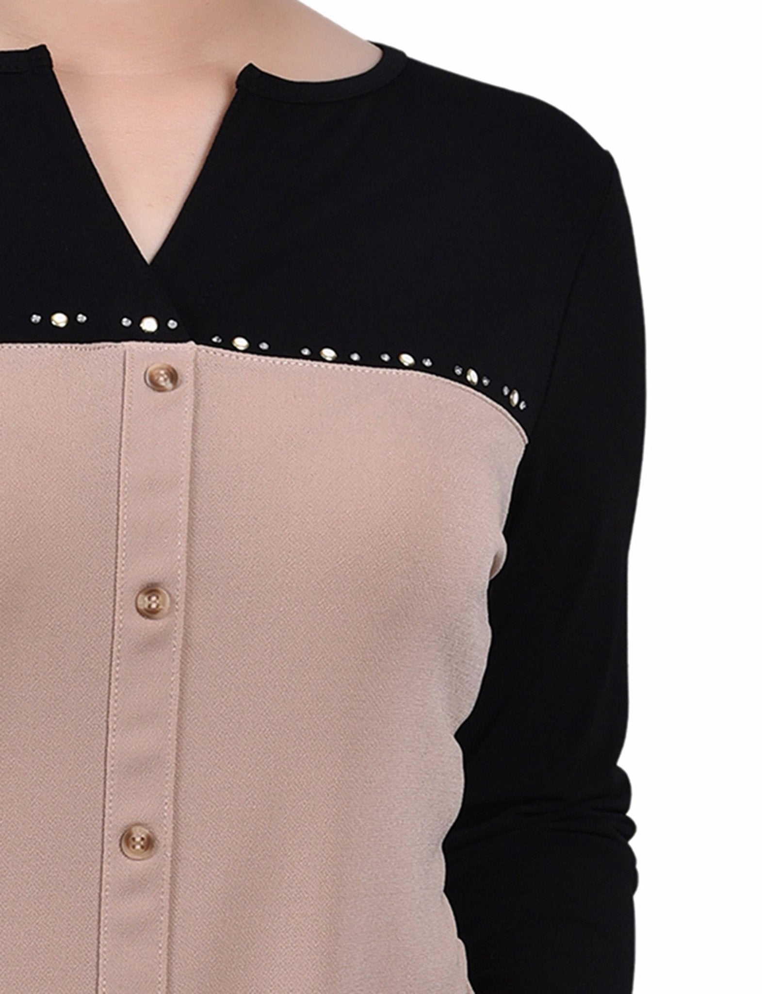 Dress it up or down, this studded neck knit crepe top can be paired with jeans or dressed up with your favorite dress pants or skirt.