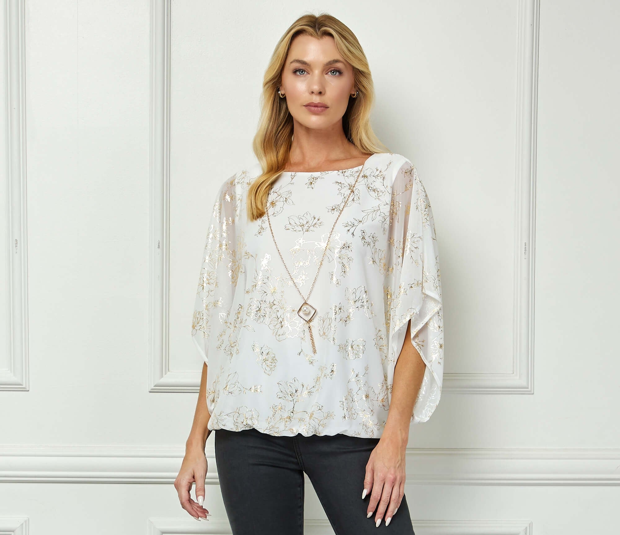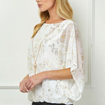 Chic and effortlessly elegant, this blouse features a flowing silhouette that flatters every figure. The poncho-style overlay drapes beautifully, offering soft movement and a sophisticated finish that transitions seamlessly from day to night.
