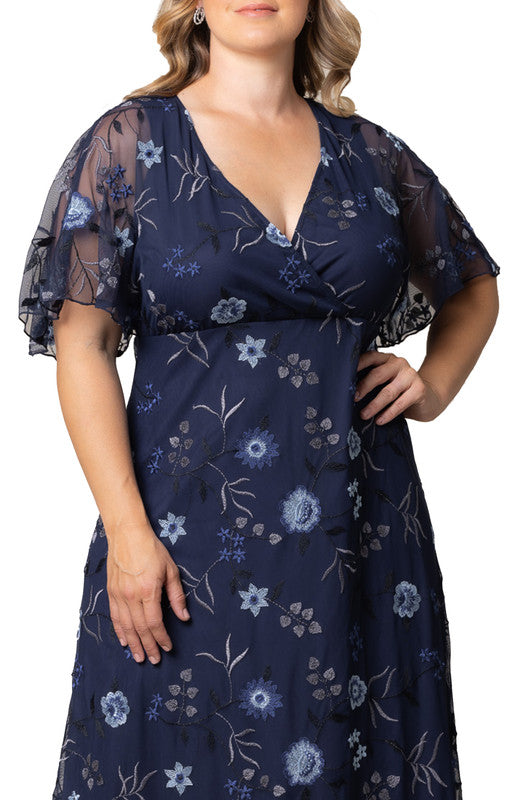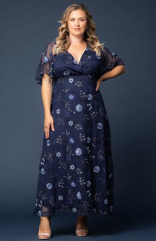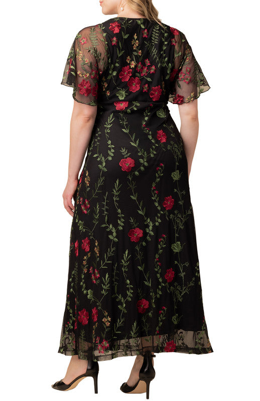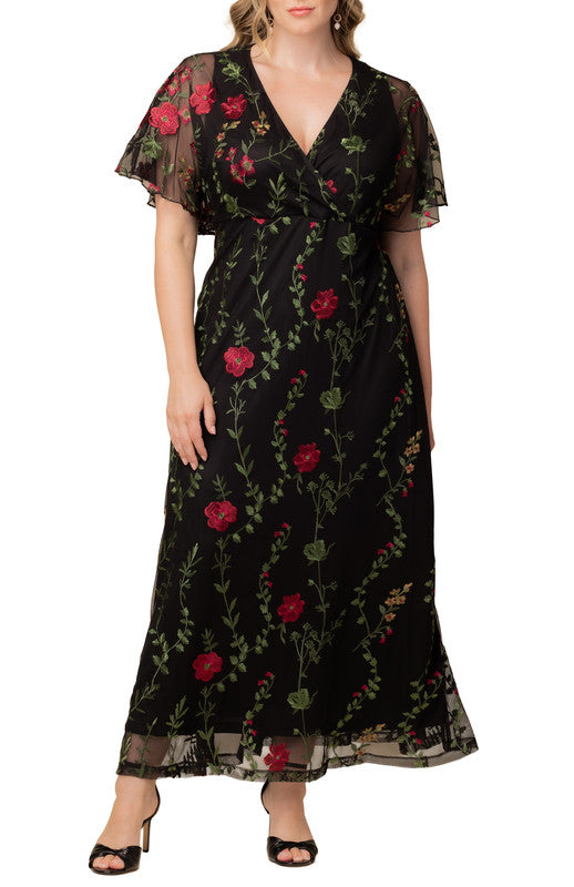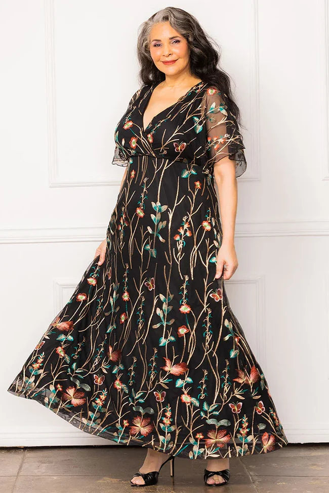 The Embroidered Elegance Evening Gown is a special occasion formal dress with stunning floral mesh embroidery. This elegant floor-length maxi dress is perfect for black-tie affairs, formal events, cocktail parties, as a ball-gown, and the perfect wedding guest or mother of the bride / groom gown.