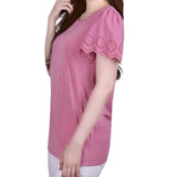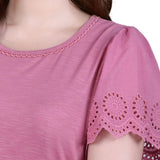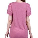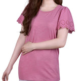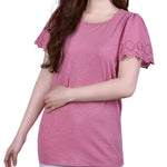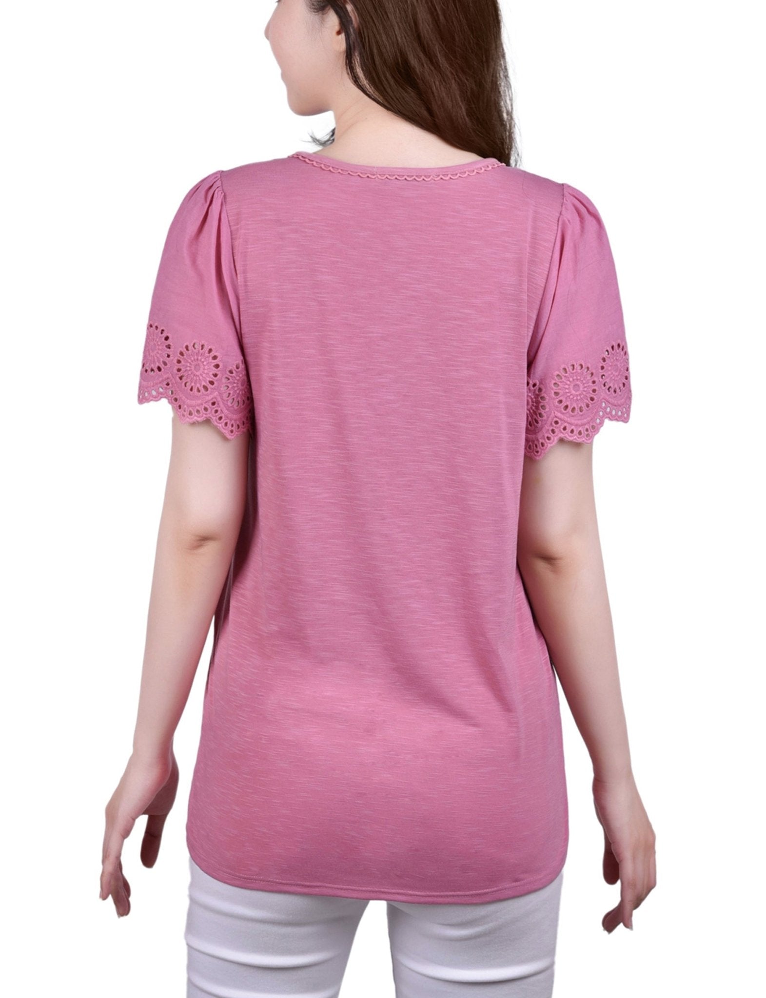 This "ready for spring" feminine top features eyelet sleeves and lace neckline edging.