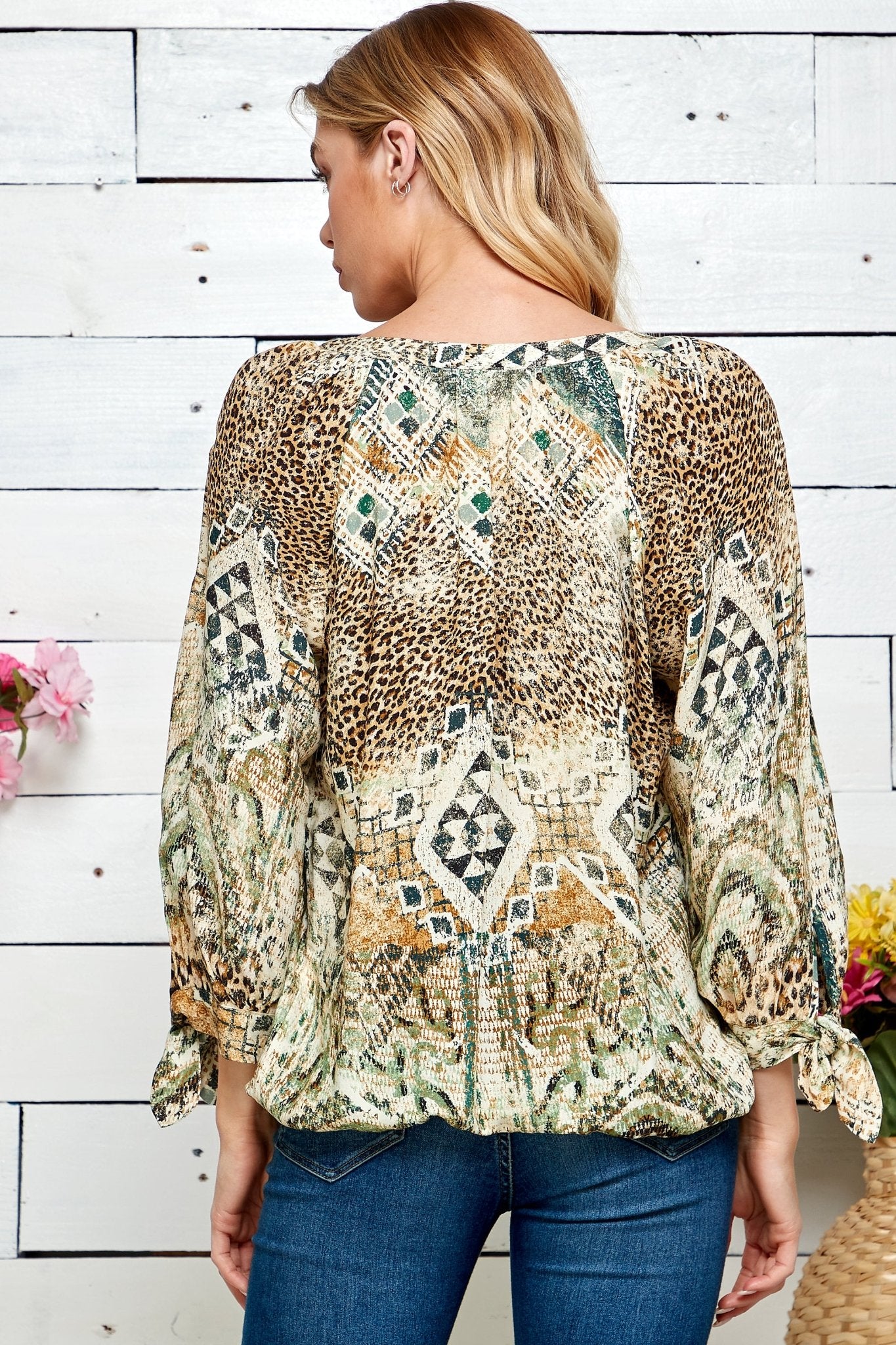Look stunning no matter your agenda in this mixed print blouse. Crafted from 100% rayon, this lightweight top is all sorts of fashion fierceness. It also has a V-neckline, ¾ tie sleeves, and a bubble hemline that’s versatile enough to be tucked in a skirt or tailored pants. Unleash your wild side in this Figueroa & Flower masterpiece that you can flaunt at work.