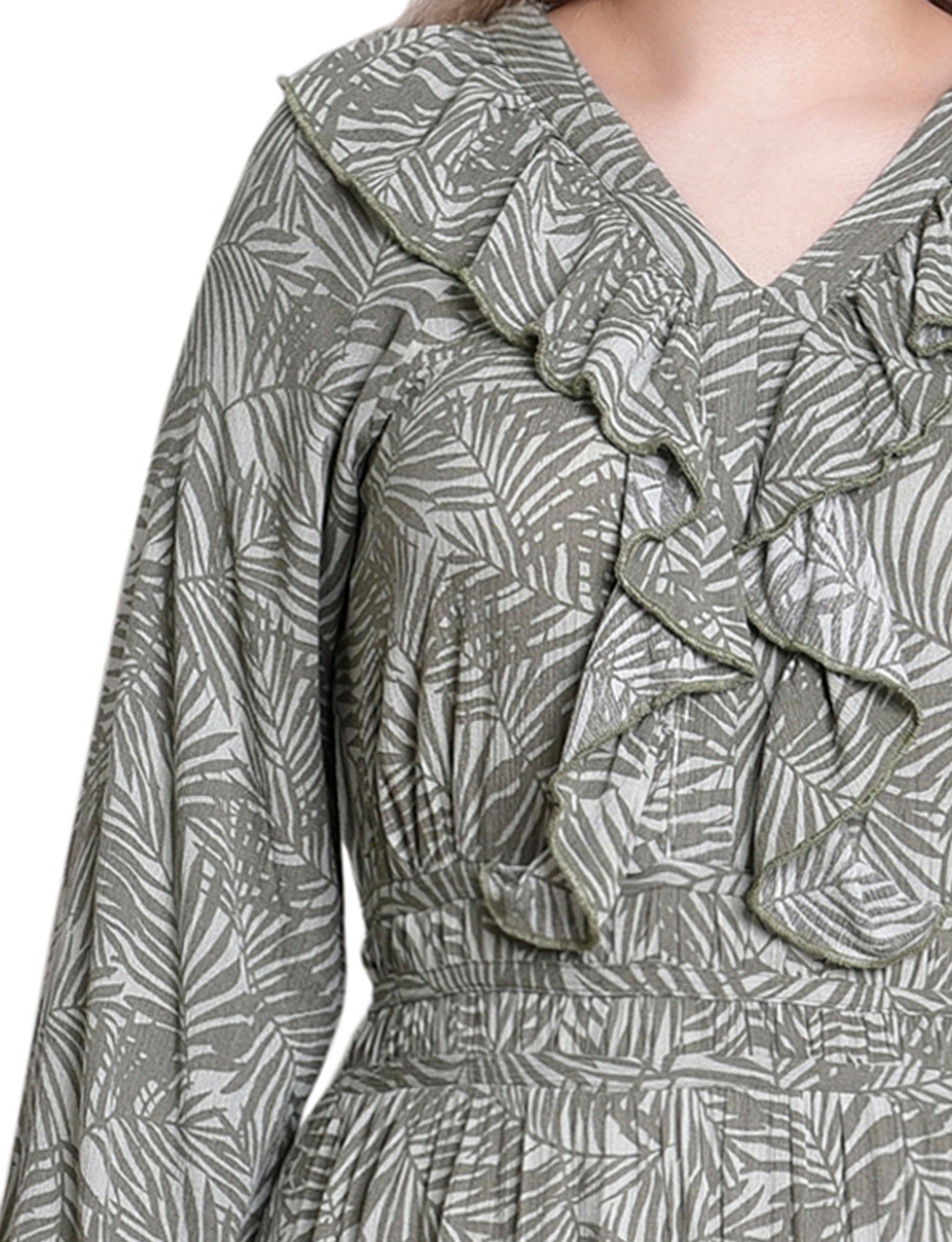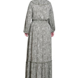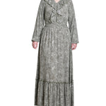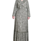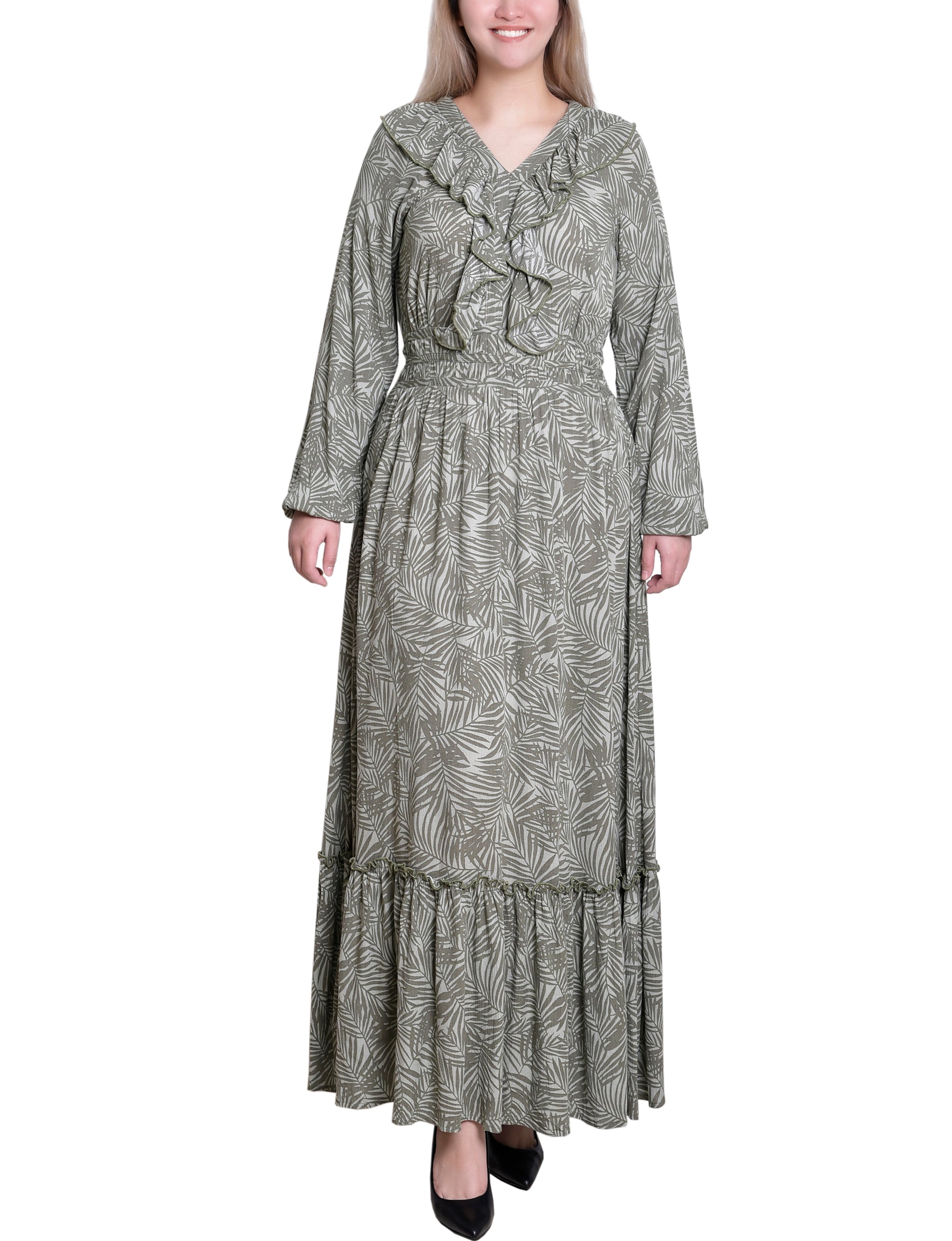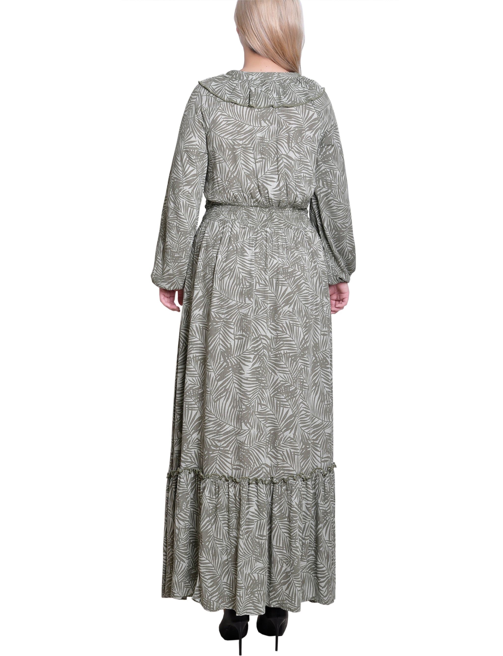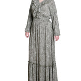 This maxi dress features a ruffled neckline and a smocked waist for a flattering fit. With long sleeves and a tiered hem, its perfect for laid-back elegance all year round.
