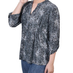 Grey Floral 3/4 Sleeve Roll Tab Y Neck Top - Petite – Dressbarn