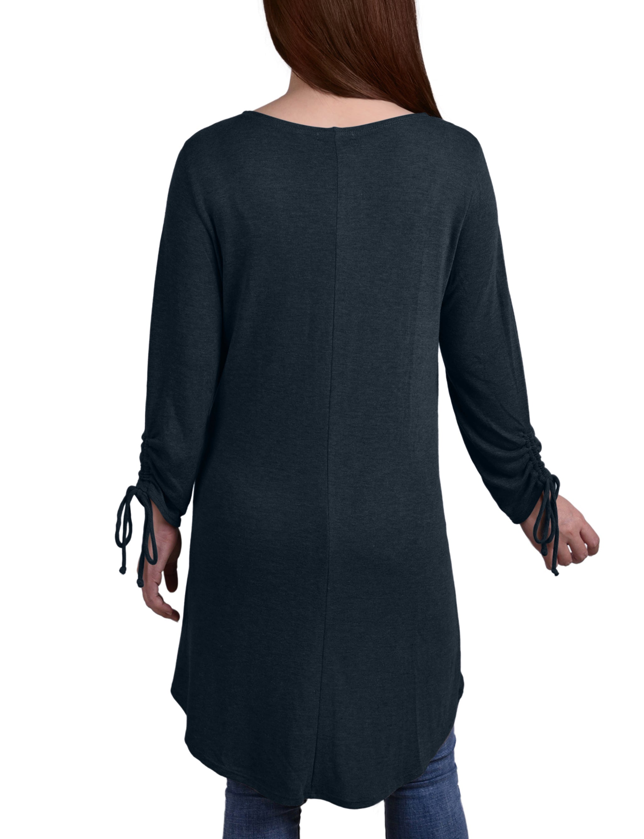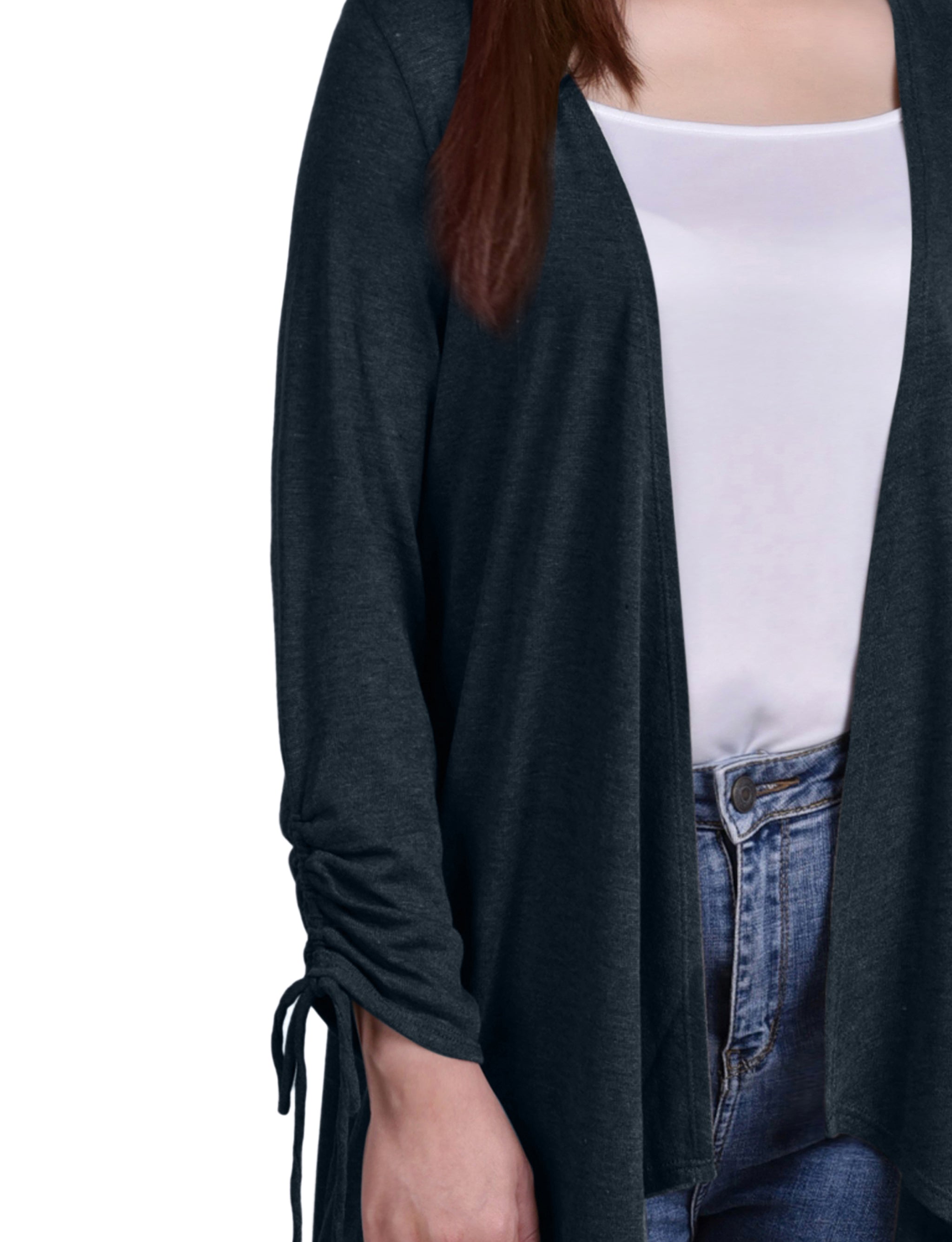With rouched sleeve details and a high low hem, thiscardigan is a twist on a classic layering piece.
