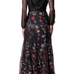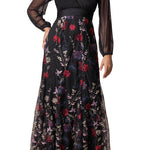 The Isabella Embroidered Mesh Formal Gown is perfect special occasion full length evening dress. This floor length design features a mesh bodice with a surplice V neckline and long sheer sleeves. A cowl neck at the back. fully-lined, softly flared skirt with embroidered flowers.