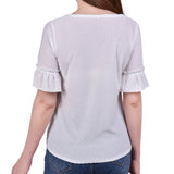 Double bell sleeves and lattice crochet inset make this a unique, feminine swiss dot blouse.