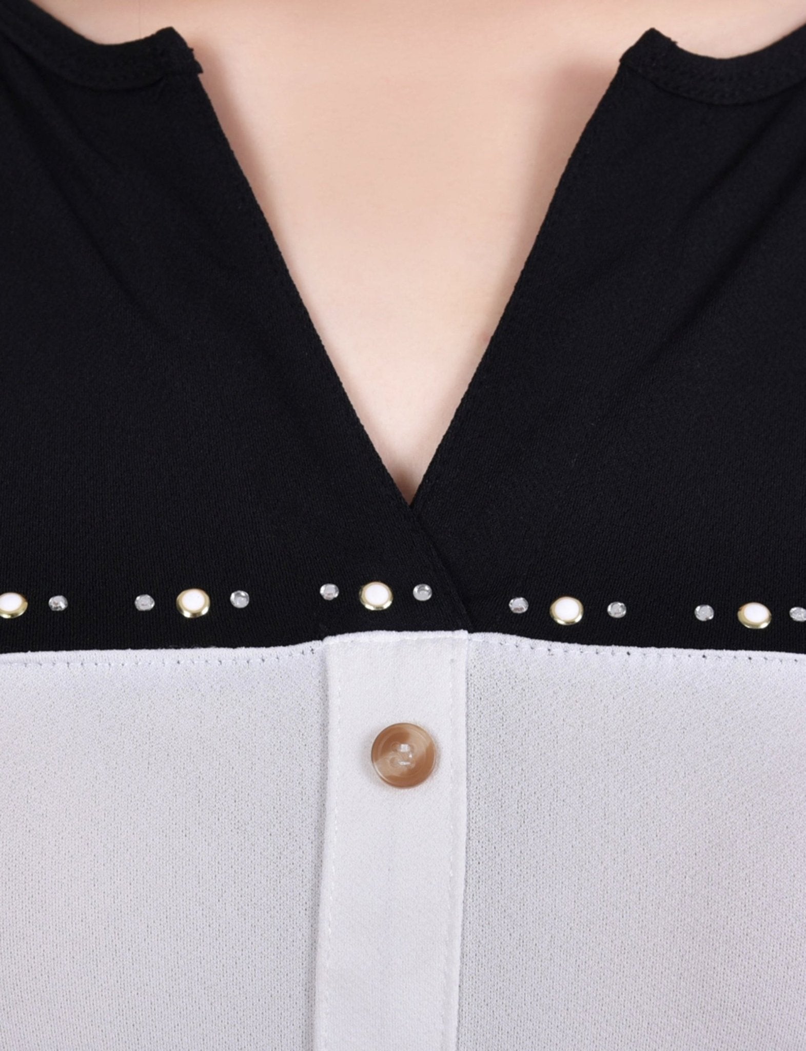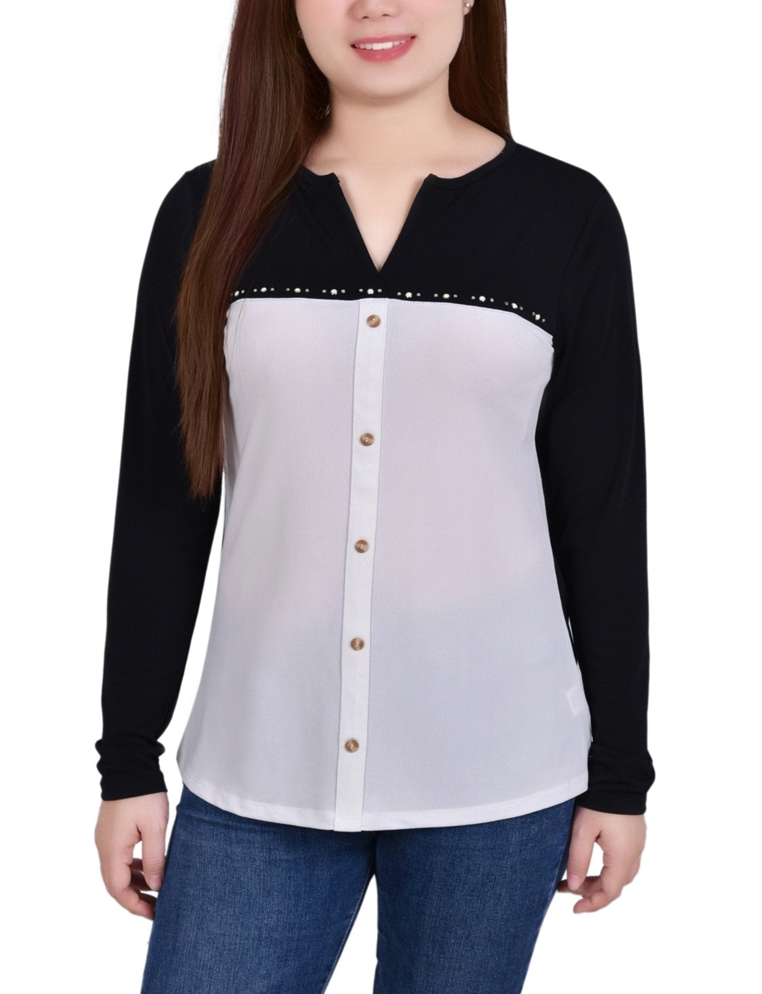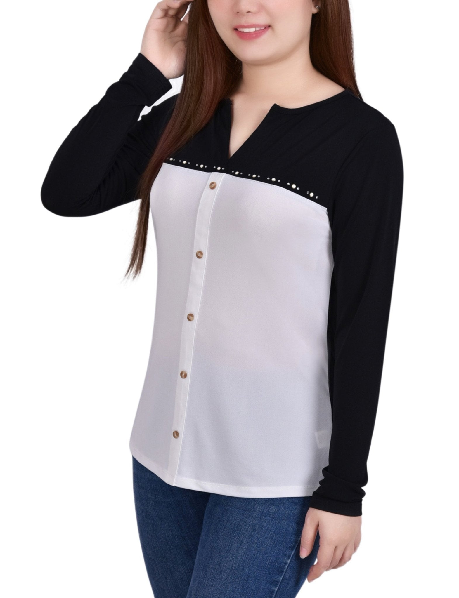 Dress it up or down, this studded neck knit crepe top can be paired with jeans or dressed up with your favorite dress pants or skirt.