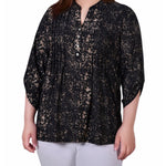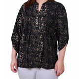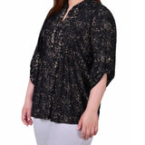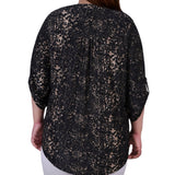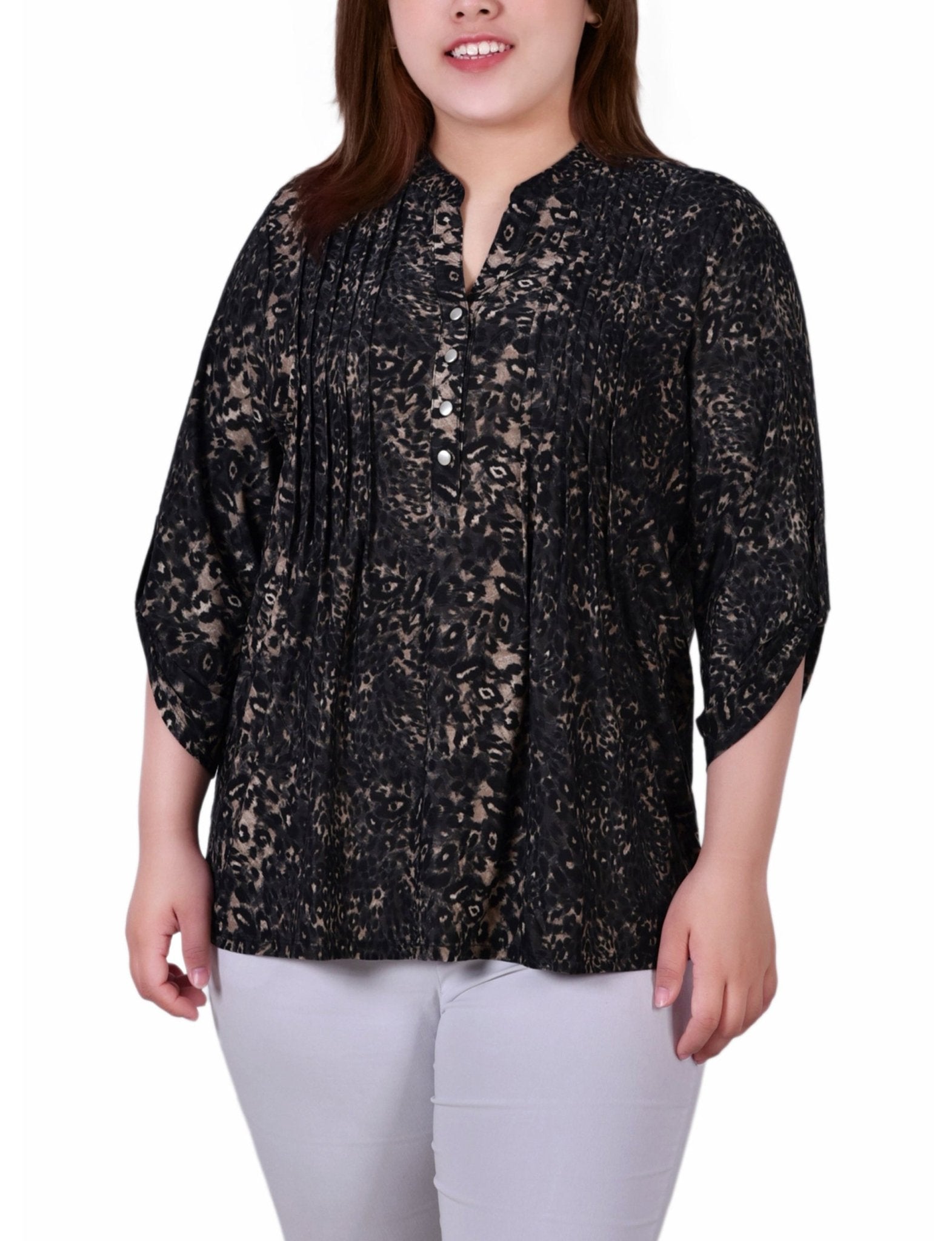 With 3/4 roll tab sleeves and a button up detail, this top is flattering on any woman.