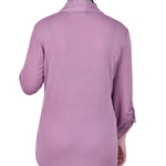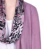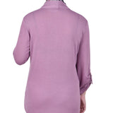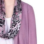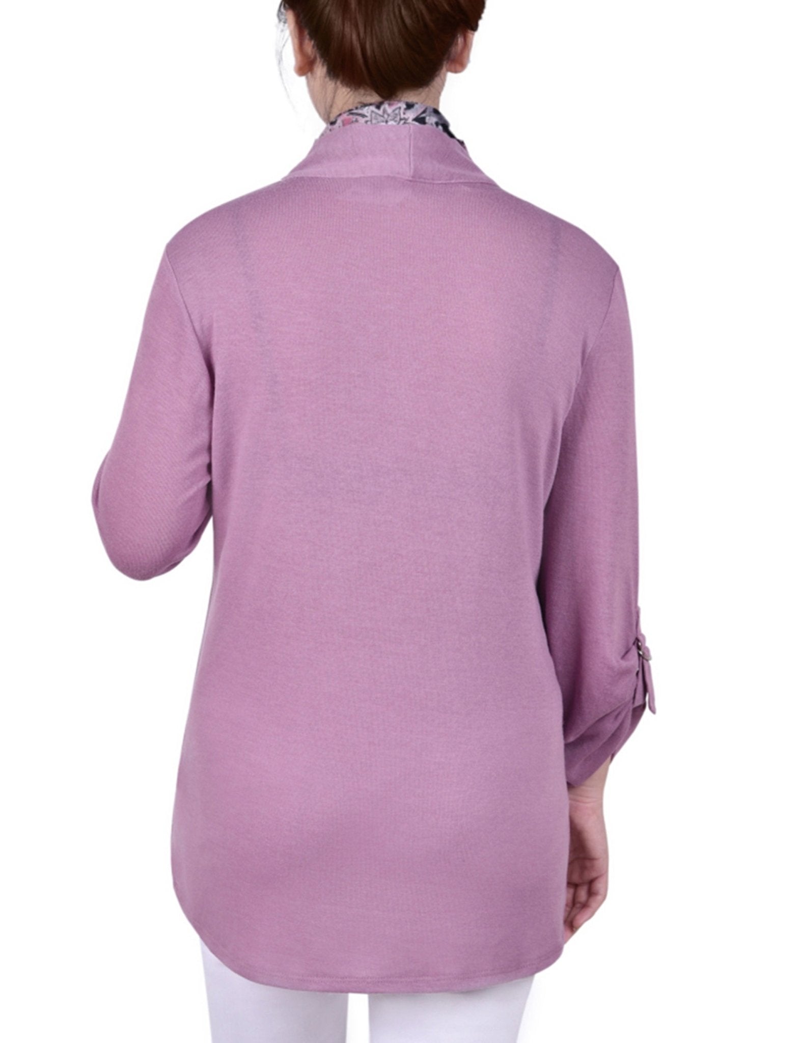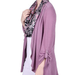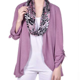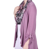 This 3-in-1 look is a necessity for any women's wardrobe, with a basic underlay, a 3/4 sleeve roll tab sleeve cardigan and a printed detachable scarf.