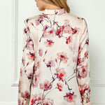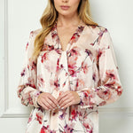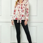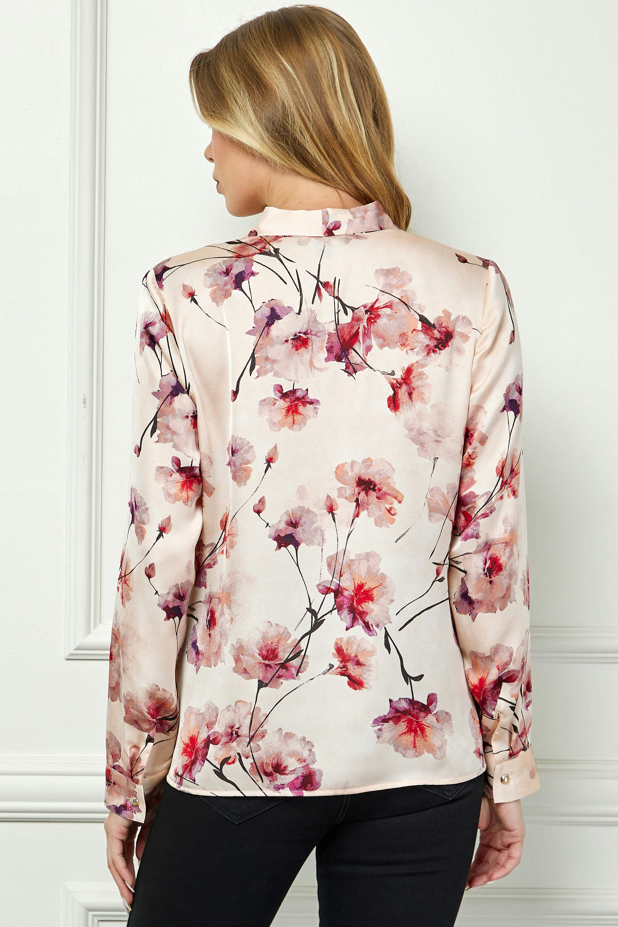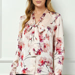 The tie neck detail offers a feminine, polished touch, while the button-front design adds classic structure. Long sleeves finished with extended cuffs create a sleek, tailored silhouette that works beautifully with skirts, trousers, or jeans for a look that transitions seamlessly from day to night.