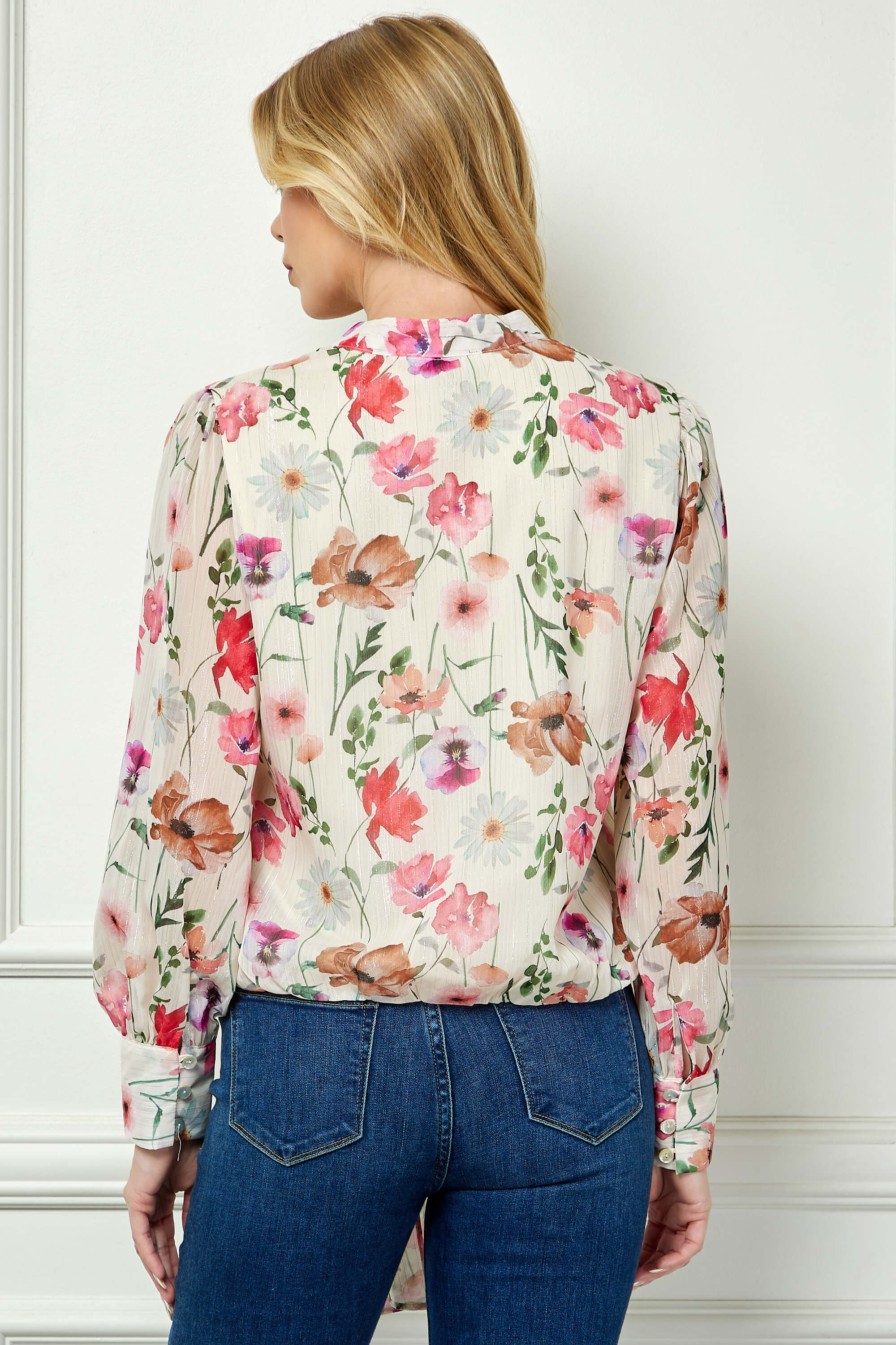 Sophisticated and thoughtfully tailored, this blouse brings polished structure to everyday styling. The V-shaped stand collar creates a sleek, elongating neckline, while the button-front design adds timeless refinement.